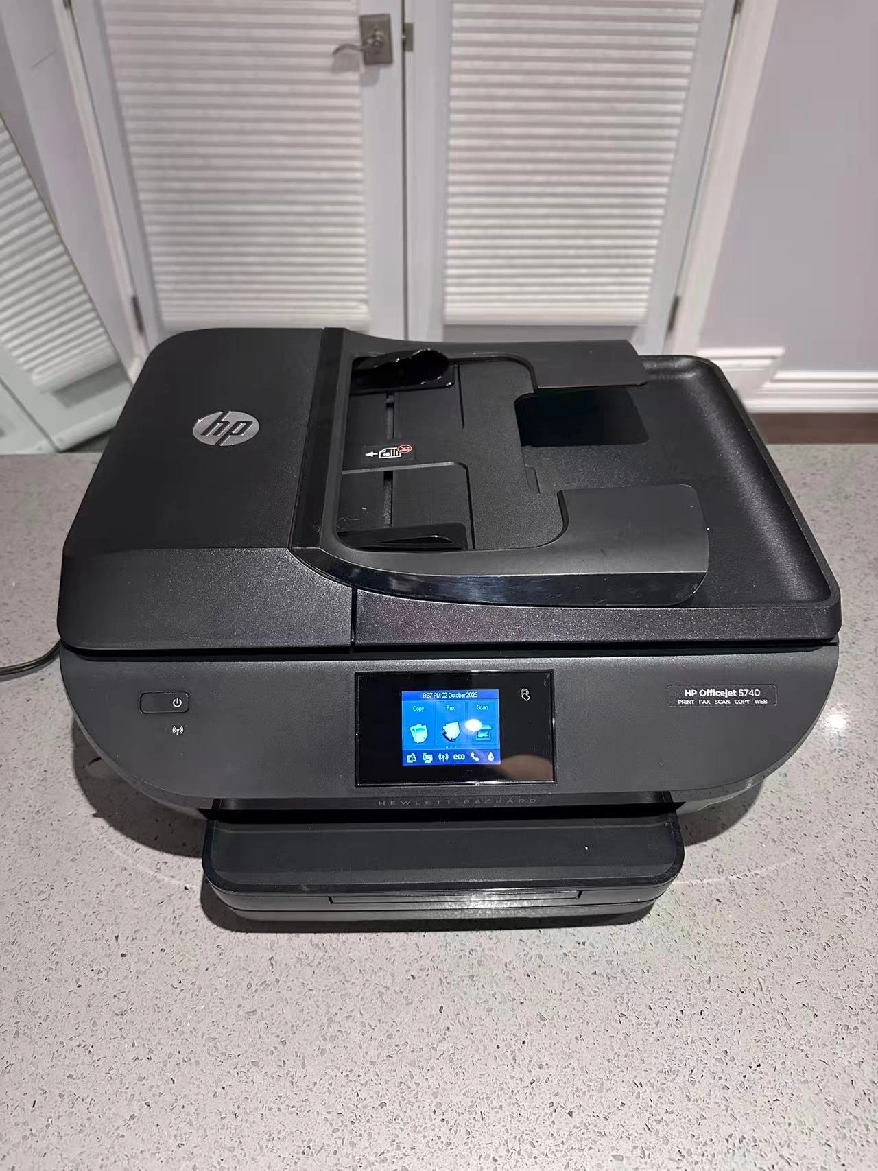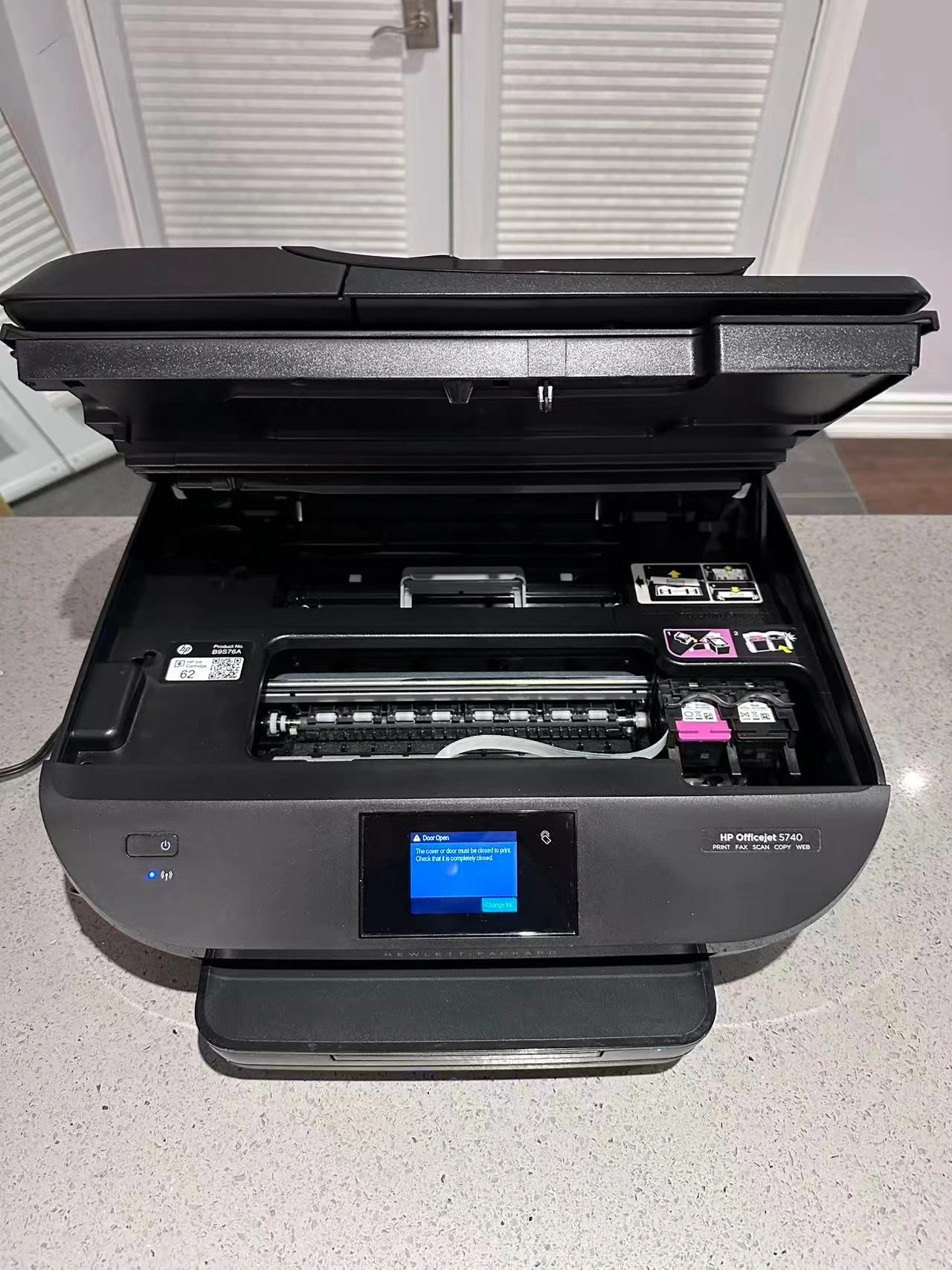 HP OfficeJet 5740 Printer – it powers on and the touchscreen works, but the document feeder keeps showing an error message (“not able to pick up the original,” as shown in the photo).