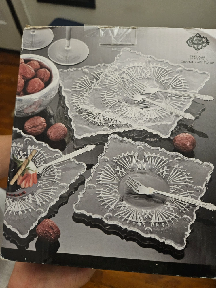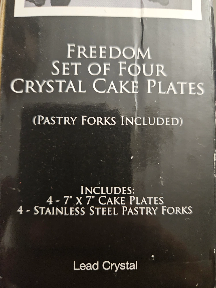 Selling a set of four Freedom crystal cake plates! This set includes pastry forks. Each plate is 7" x 7" and made of lead crystal. The set includes four stainless steel pastry forks and comes in its original box