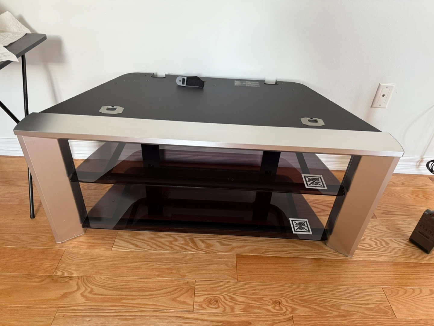Selling a modern TV stand that's perfect for your living room setup! It features sleek glass shelves and a sturdy frame. The stand is in great condition and ready to hold your TV and media devices. The dimensions are approximately 21 inches in height and 48 inches in length.