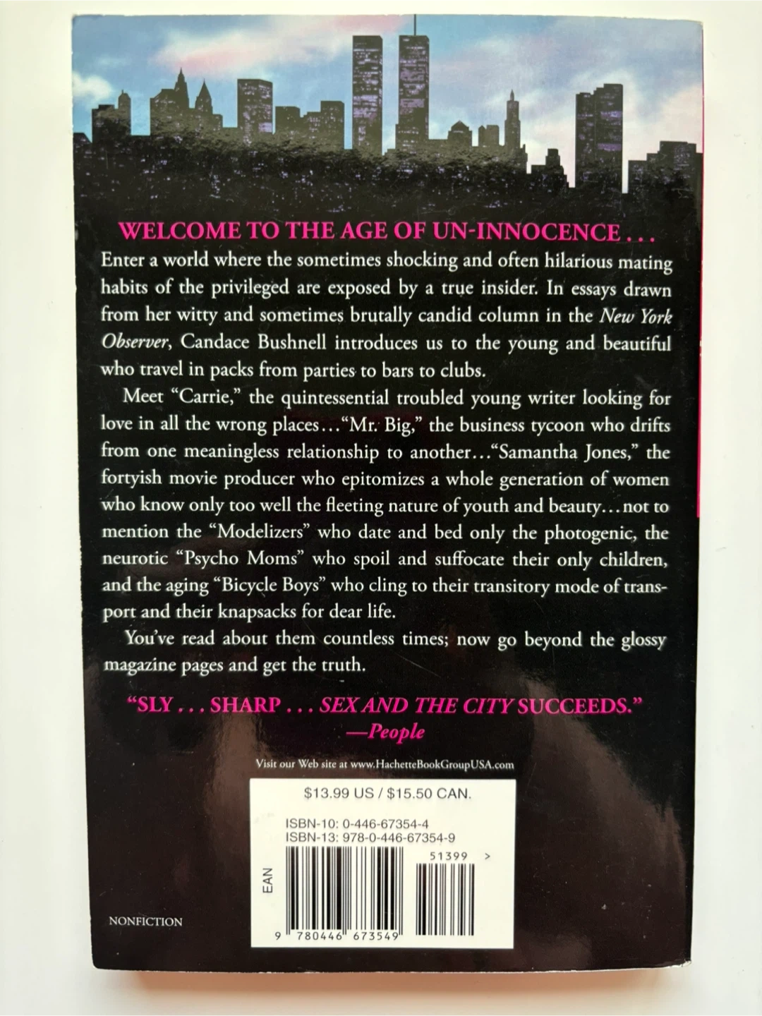 Selling a copy of Sex and the City by Candace Bushnell! It's a non-fiction book. The cover says "Now a major motion picture". The back cover price is $13.99 US/$15.50 CAN