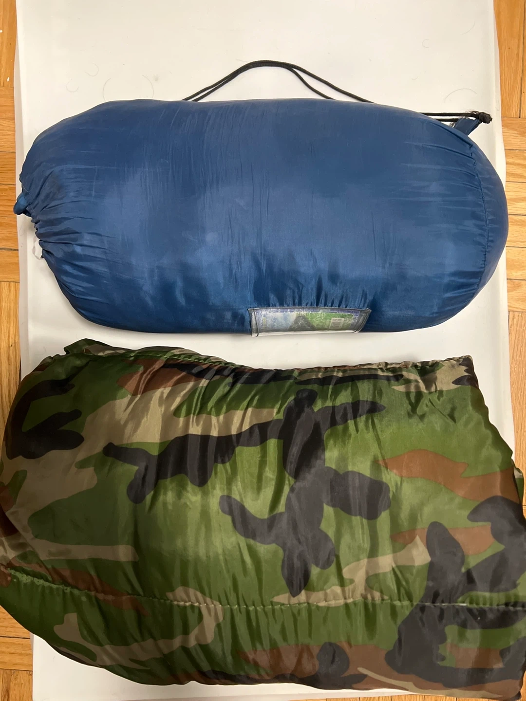 Selling a sleeping bag in great condition! It comes in two stuff sacks, one in blue and the other in a camouflage pattern. Perfect for camping or backpacking adventures.