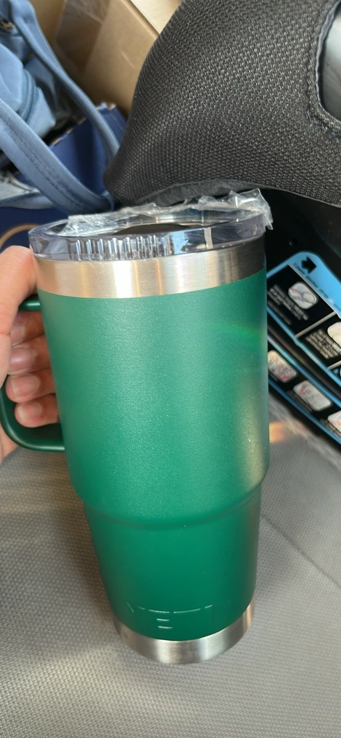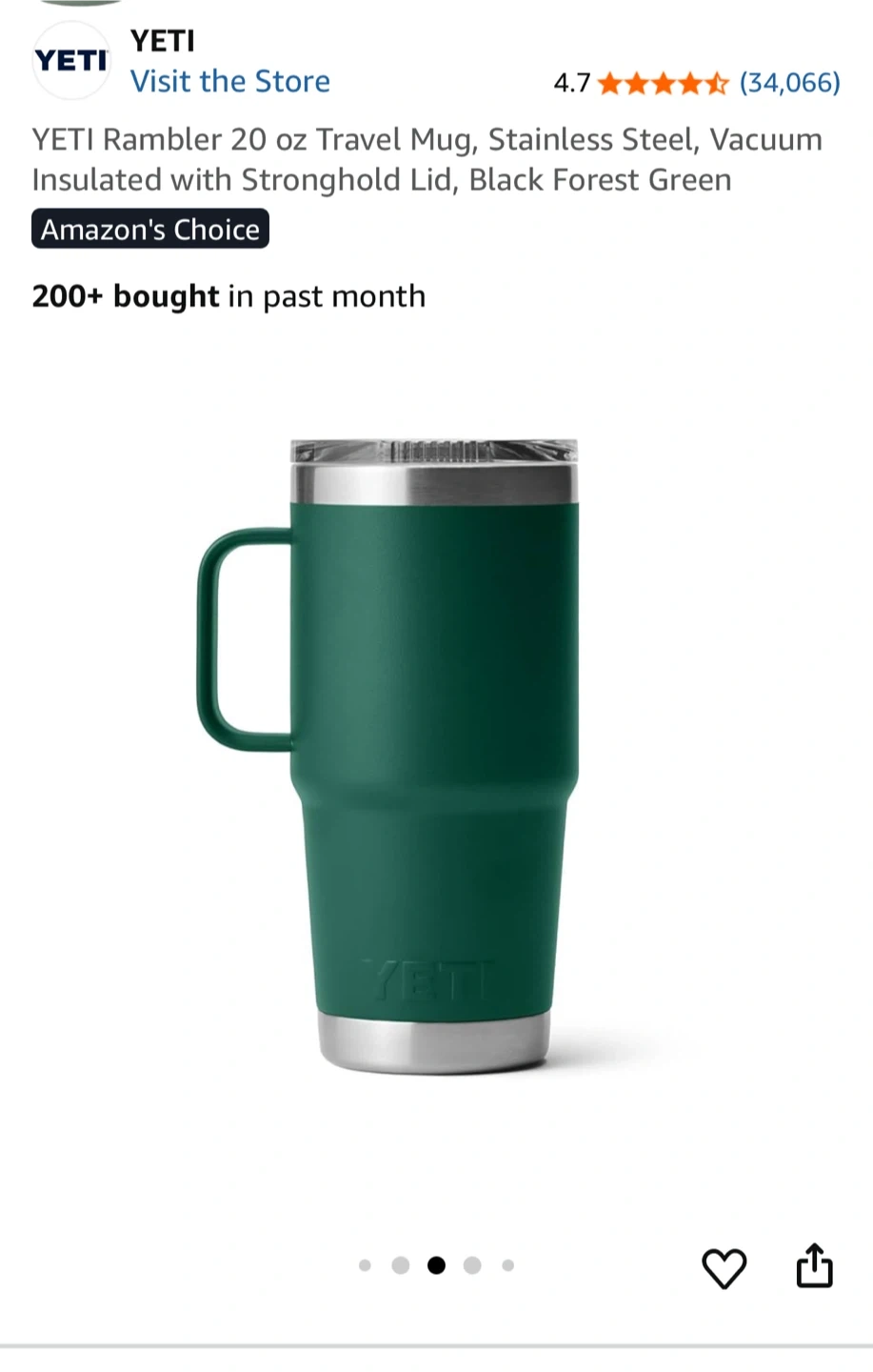 Looking to sell a YETI Rambler travel mug in the 20 oz size! It's in the Black Forest Green colour, and it's vacuum insulated with a stronghold lid. Perfect for keeping your drinks hot or cold on the go!