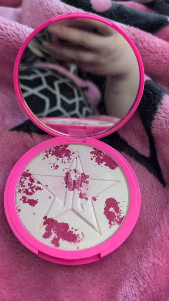 New but swatched Jeffree Star limited edition Halloween icy execution highlighter featuring the base with a blood splat pattern, it's like a 3 in one highlighter with the red, base and if you mix the two.