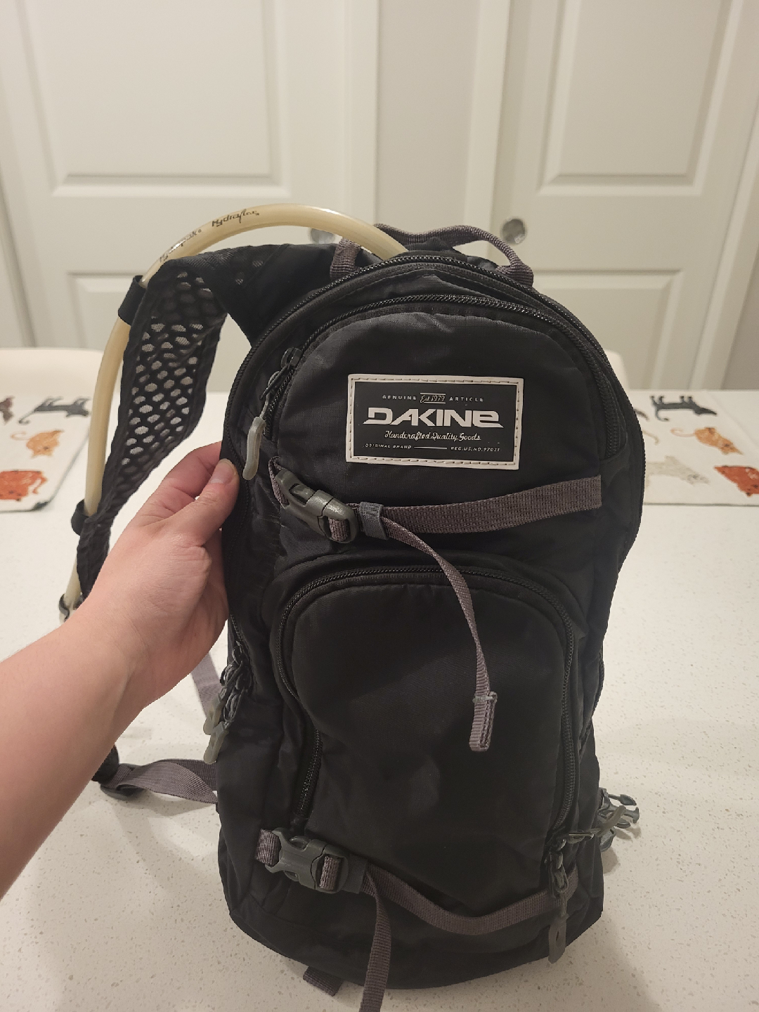 Dakine mini backpack in great condition! Perfect for hiking, biking, or any outdoor adventure. It features multiple compartments for storage and a comfortable design for all-day wear. The interior is a bright blue colour. *The drinking tube has been taken out.