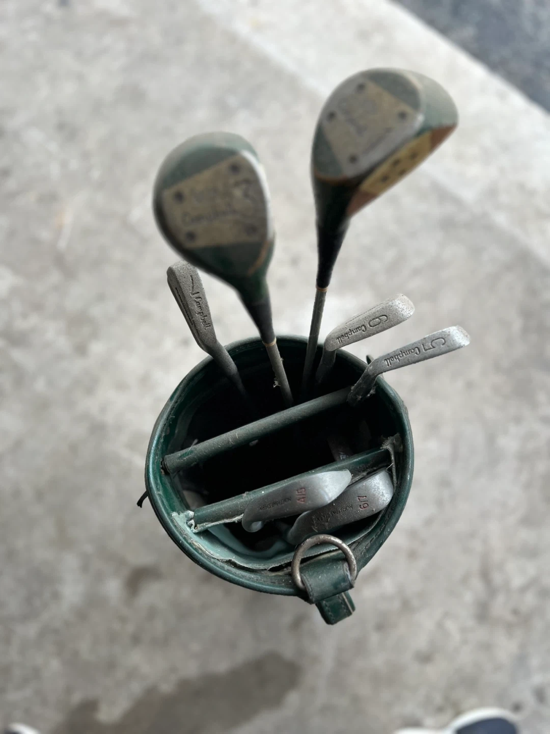 73Selling a set of vintage junior right handed golf clubs with a green golf bag. The clubs appear to be older models, perfect for a collector or someone interested in classic golf equipment. Please take a look at the photos for details on the condition of the clubs and the bag