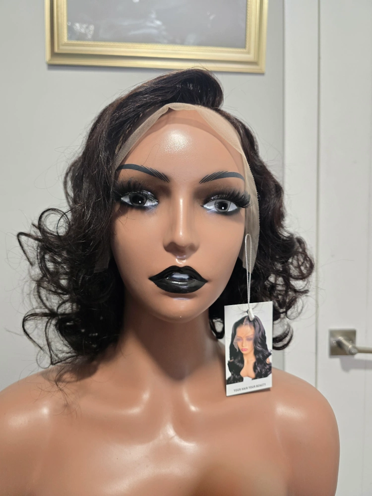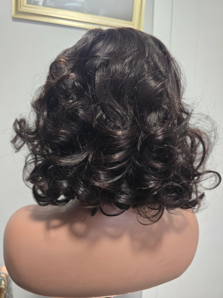 Selling a black human hair wig, about shoulder length. It has a lace front and is styled with curls. Great for a new look!
