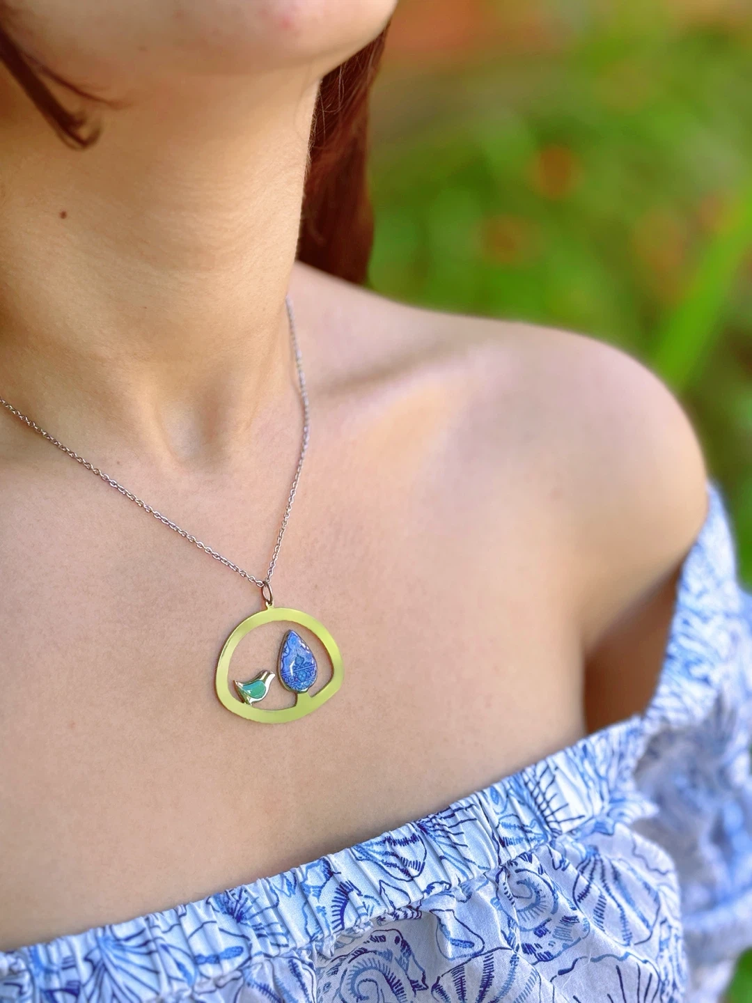 A necklace with a unique pendant featuring a bird and a teardrop design. The pendant has a silver chain. The pendant has a green and blue colour.