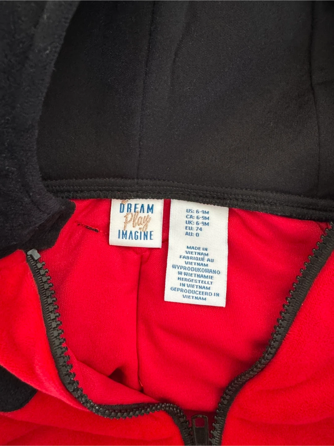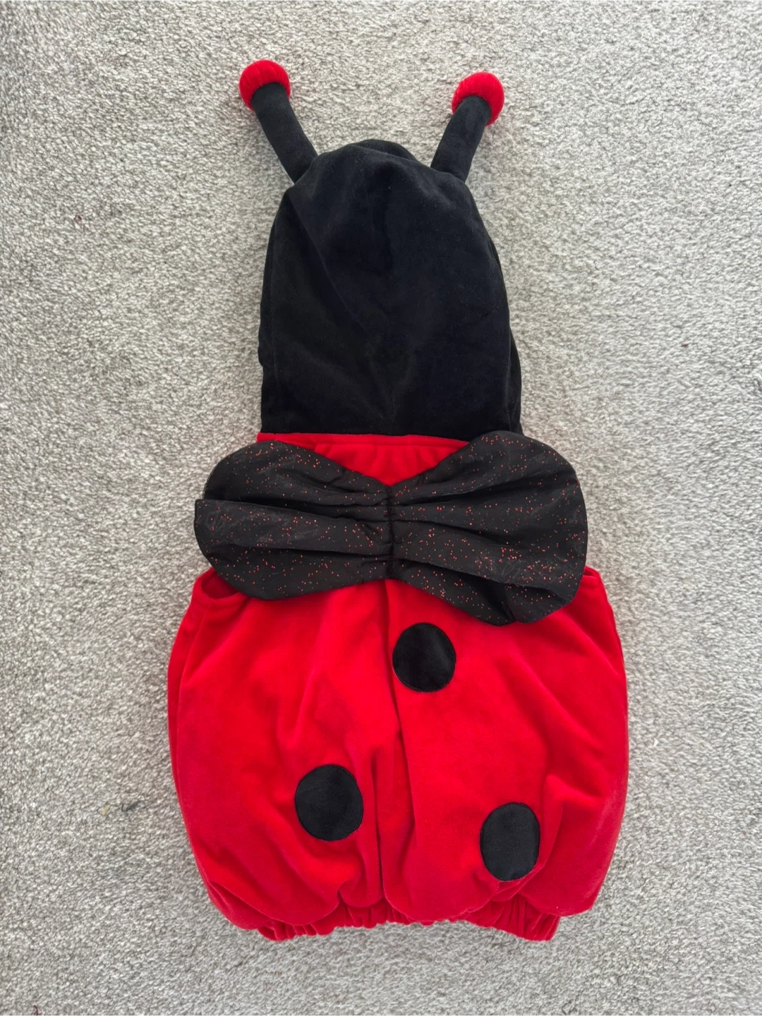 A cute ladybug costume from Dream Play Imagine, perfect for your little one! It's sized 6-9M and features a soft, plush material in red and black. Perfect for dress-up or Halloween!