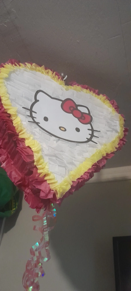 Selling a cute Hello Kitty heart-shaped piñata! It's decorated with pink and yellow fringe. Perfect for a party!