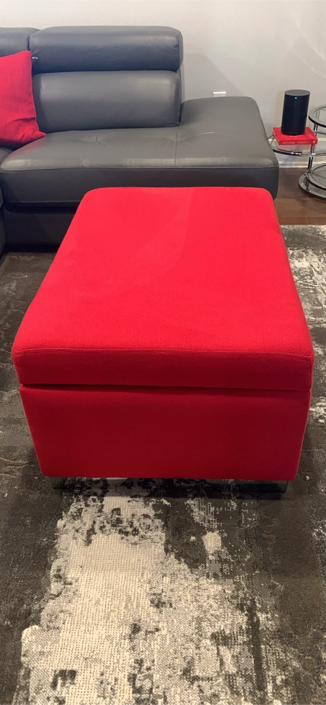 Selling a red storage ottoman. It's in great condition and perfect for adding extra seating and storage to your living room or bedroom. The ottoman features a lift-up top, revealing a spacious storage compartment inside. It is a vibrant red colour with a stylish design.