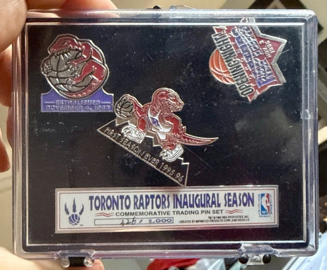 208This Toronto Raptors Inaugural Season Commemorative Trading Pin Set is a cool piece of sports memorabilia! It's a limited edition, with this one being #326/2000. This set celebrates the Raptors' first season and includes three pins in a display case. * Commemorates the Toronto Raptors' inaugural season * Limited edition: #326 of 2,000 * Includes three commemorative pins * Comes in a protective display case If you're seeing this ad, the item is still available!