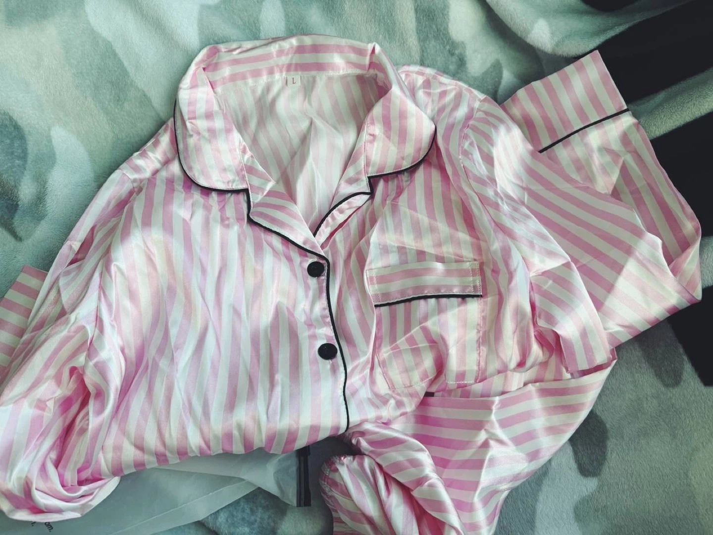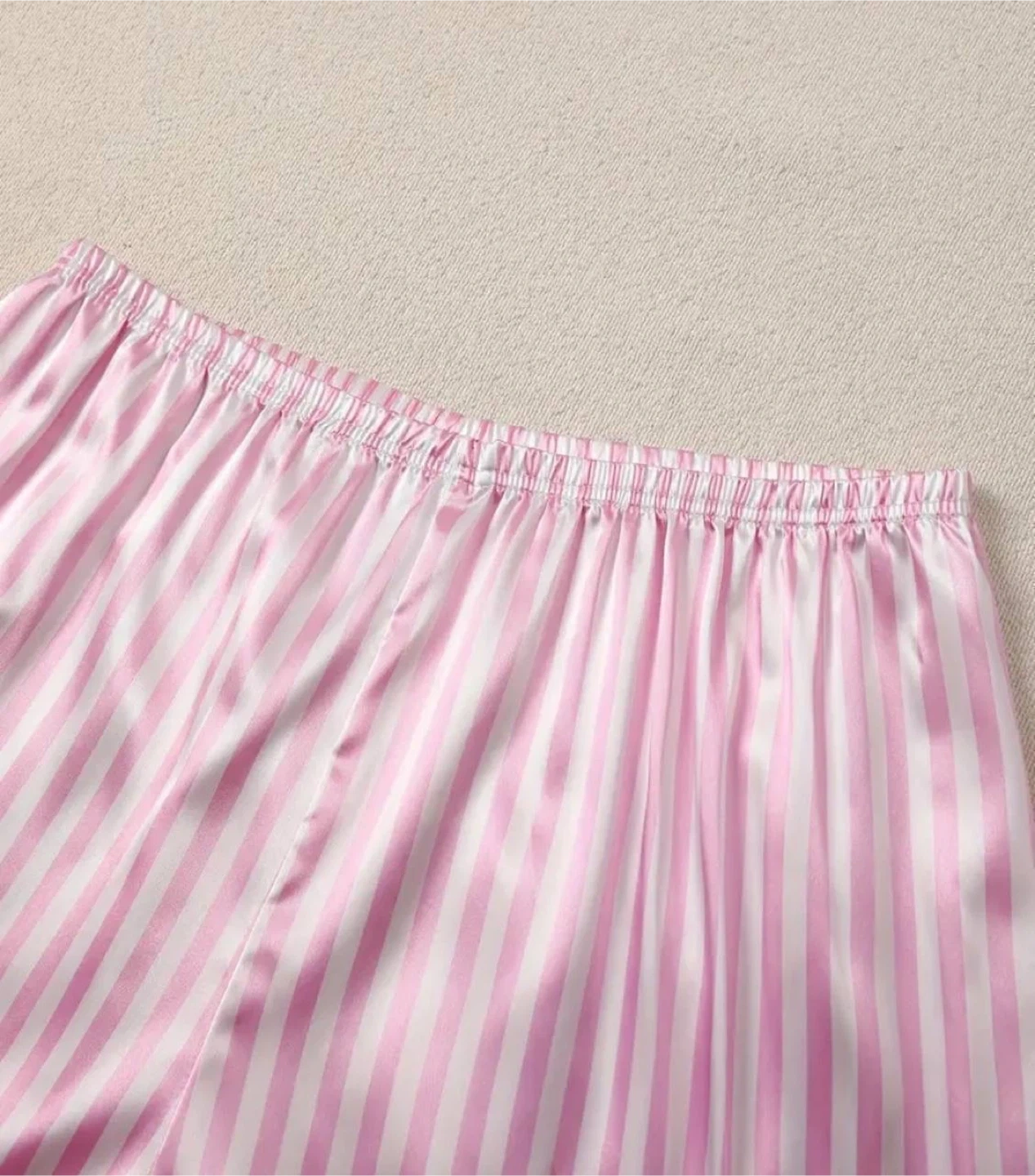 Pink striped satin pajama set with long sleeves and pants. Button up top with a pocket. Elastic waistband on the pants.