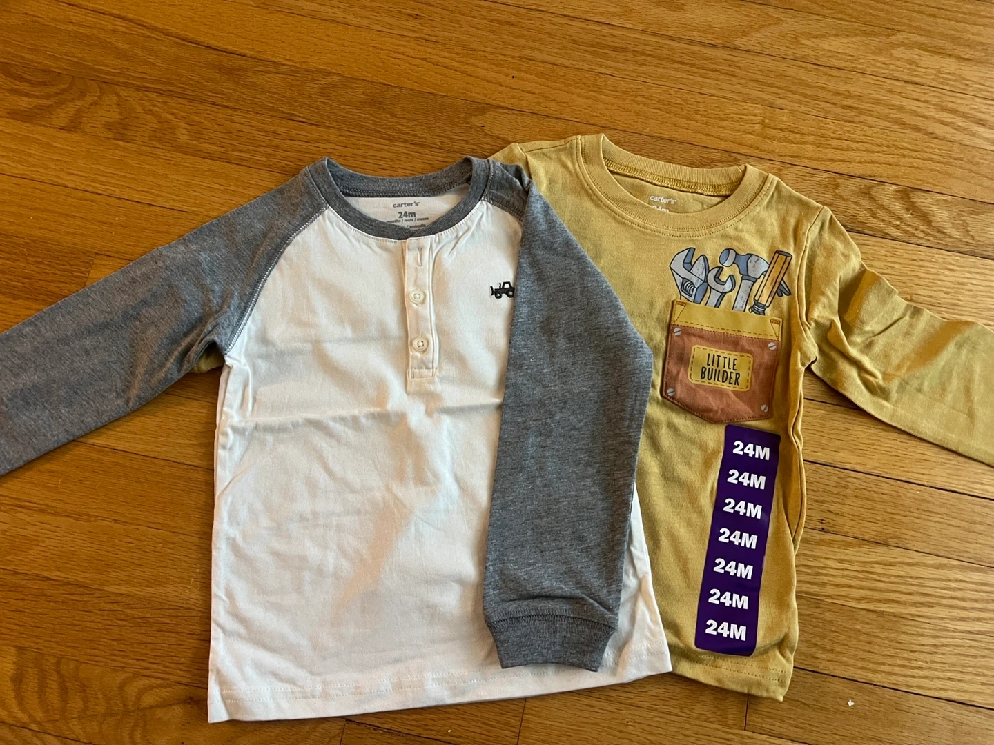 Selling a set of Carter's baby clothes in size 24M. Includes a pair of camo pants and two long-sleeved shirts. All items are new and ready for a new home! Items come from a pet and smoke free home. Port union/401/Pickering for pick up.