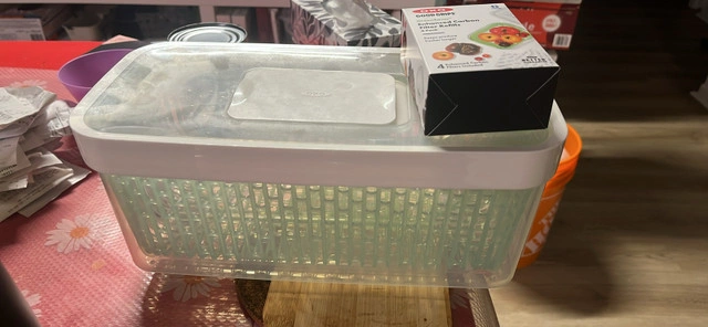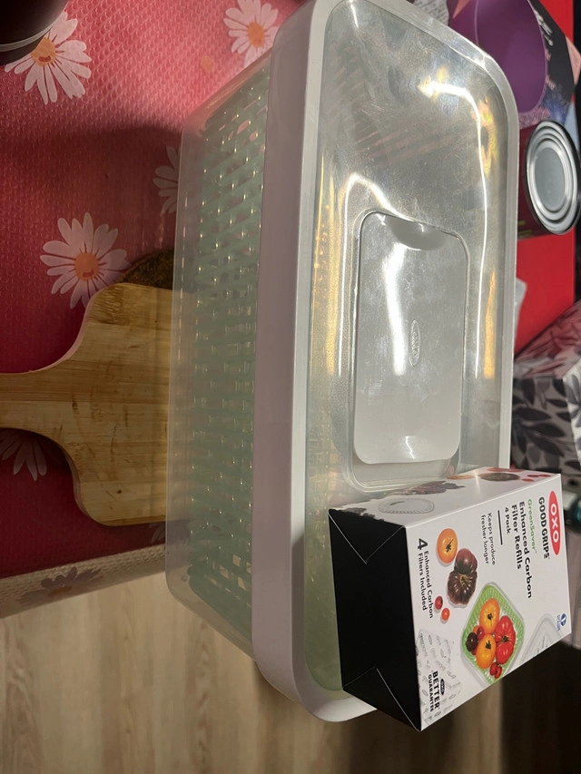 Keep your greens crisp and your fruits fresh with this Oxo Good Grips GreenSaver produce keeper, complete with enhanced carbon filter refills! 4 extra refills Additional features include: * 4.7 Qt Capacity * Activated Carbon Filter * Keeps produce fresh for longer