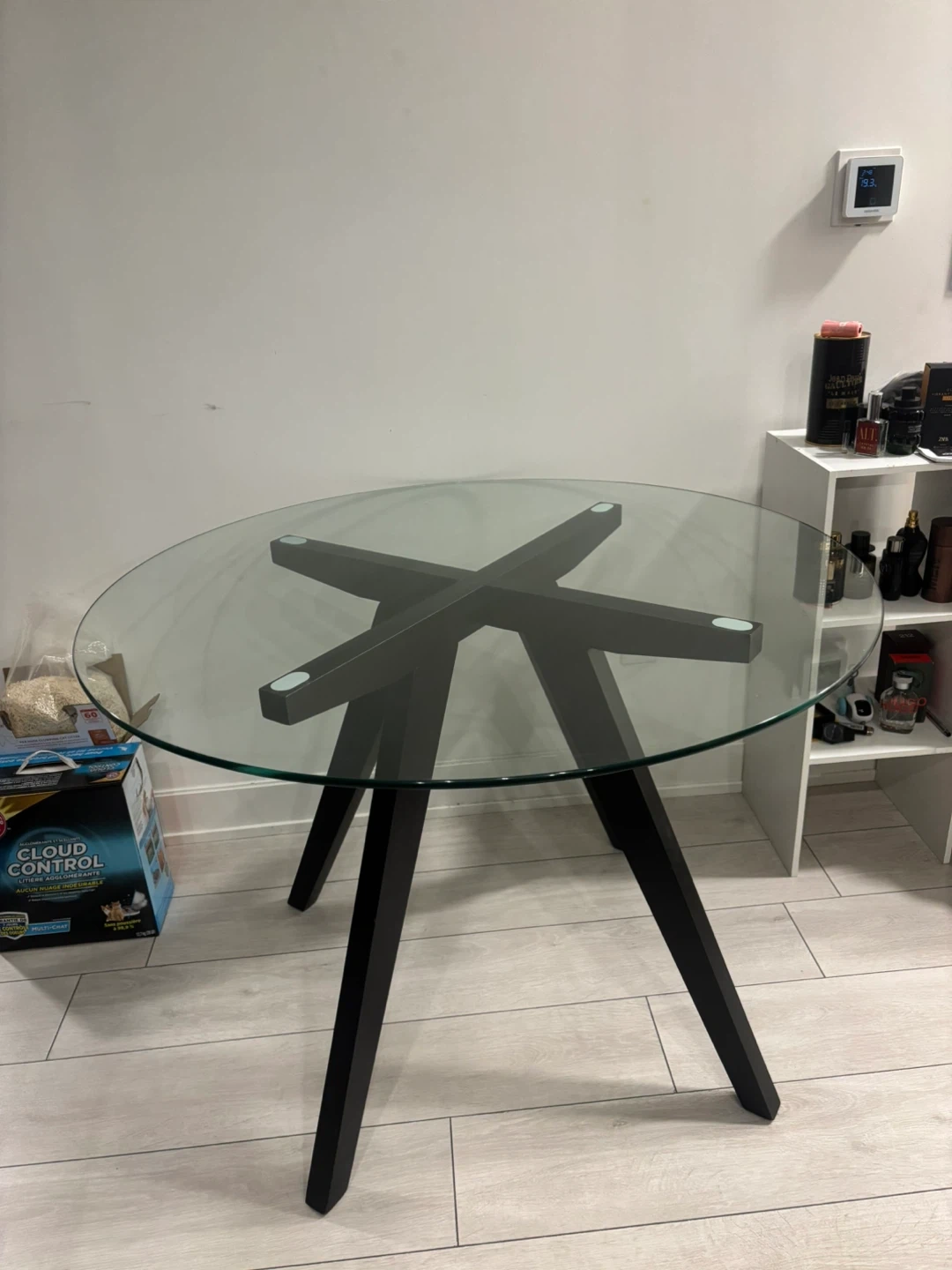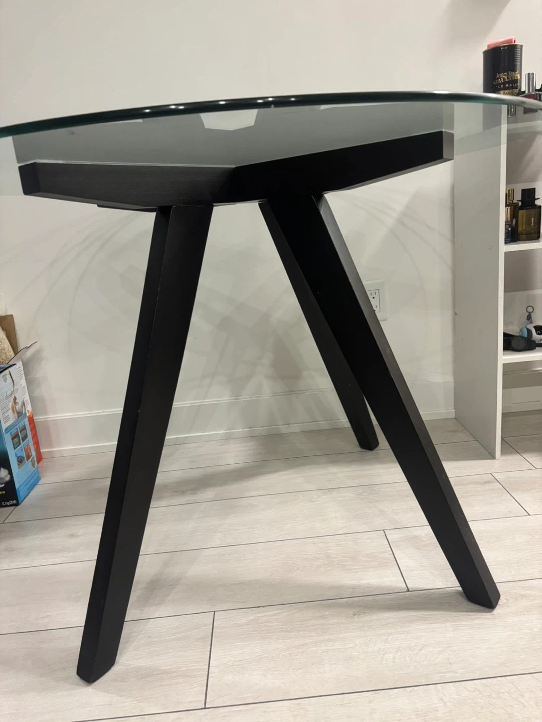 Selling a round dining table with a glass top and a black wooden base. It's in great condition and perfect for a small dining area or kitchen. The simple design is easy to match with any decor!