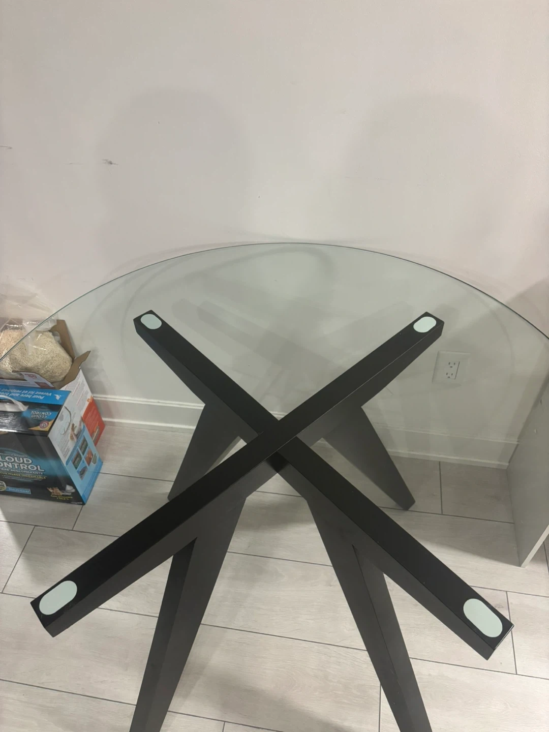 Selling a round dining table with a glass top and a black wooden base. It's in great condition and perfect for a small dining area or kitchen. The simple design is easy to match with any decor!