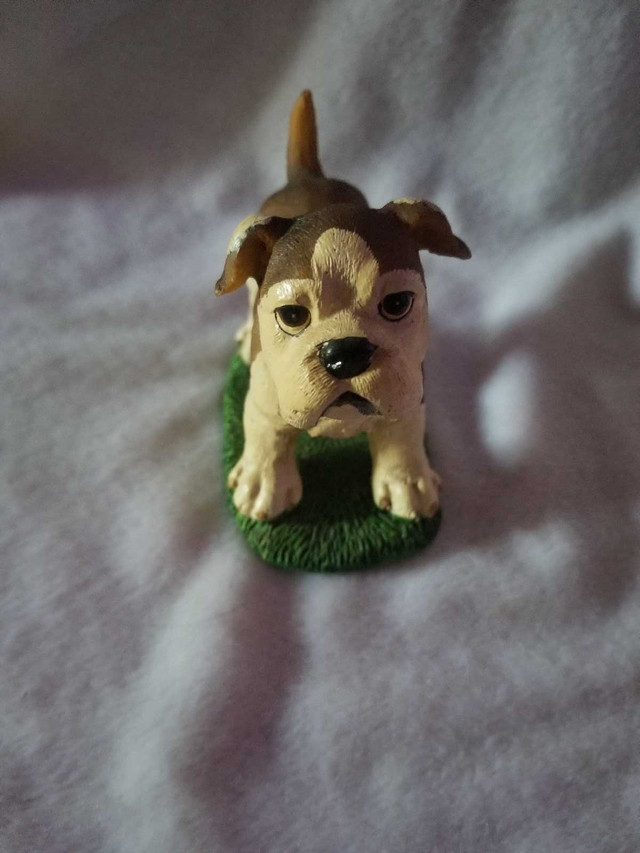 This charming dog figurine captures the playful spirit of a puppy, featuring detailed textures and a lifelike pose, perfect for collectors or dog lovers; previously displayed.