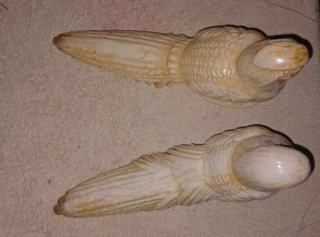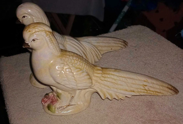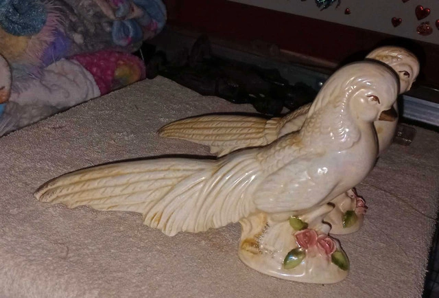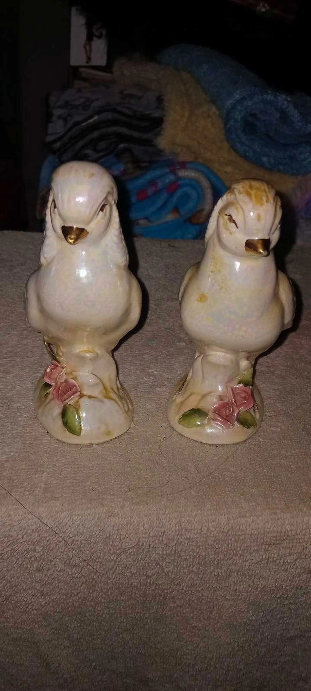 These charming dove figurines are a delightful addition to any home decor. They're made of ceramic and feature intricate details, perfect for collectors or anyone who appreciates vintage aesthetics. They are used, but still in good condition.