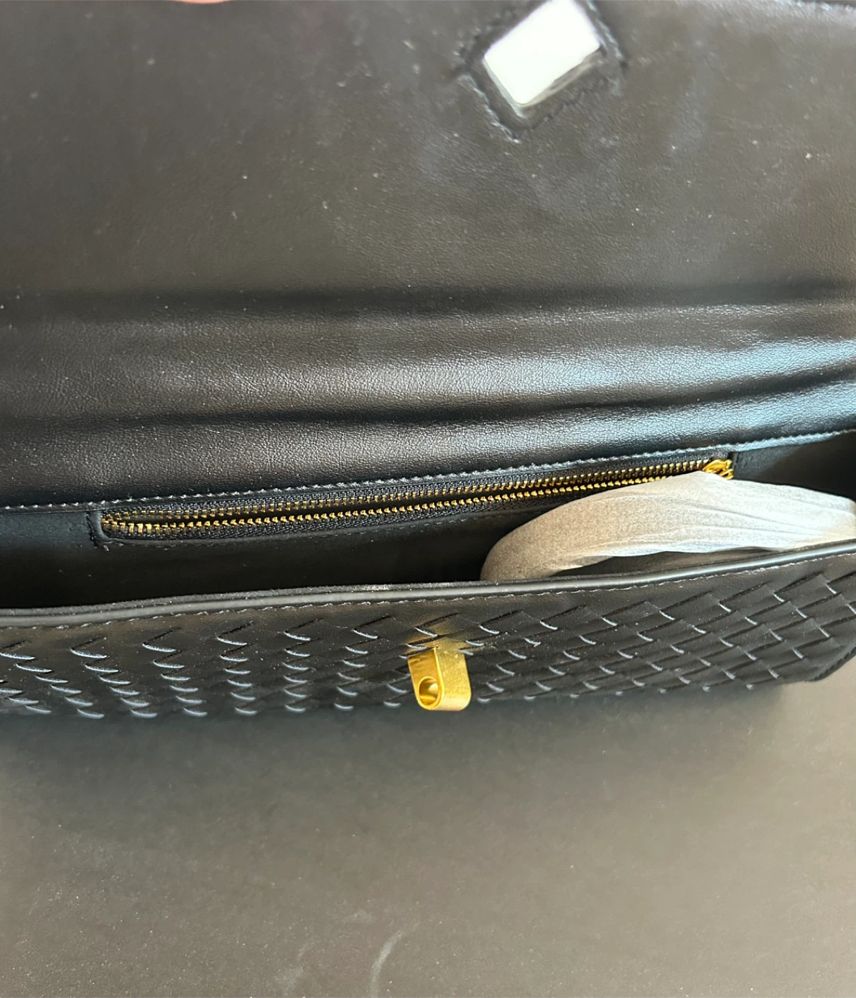 Stylish bags in a classic black woven design! It's in great condition and perfect for adding a touch of elegance to any outfit. The interior has a zipper and the clutch also has a handle.