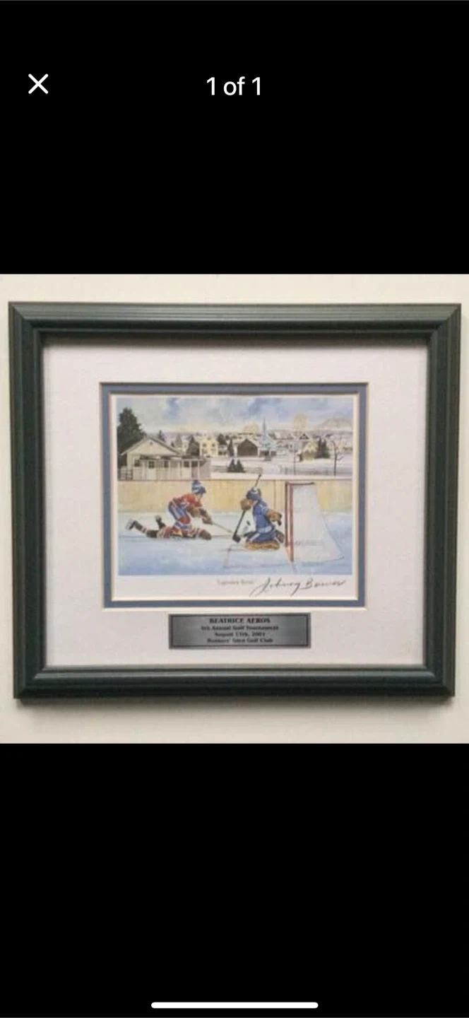 Framed print of a hockey scene signed by Johnny Bower. The print commemorates the Beatrice Aeros 5th Annual Golf Tournament on August 11th, 2001 at the Bankers' Shea Golf Club P/U Brampton $125