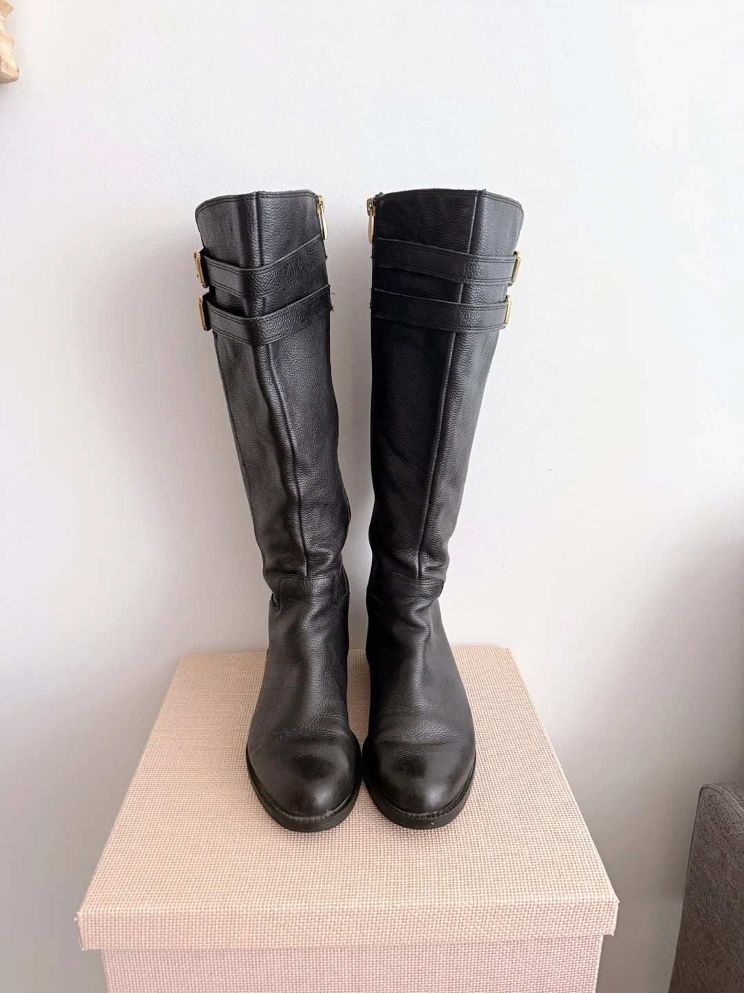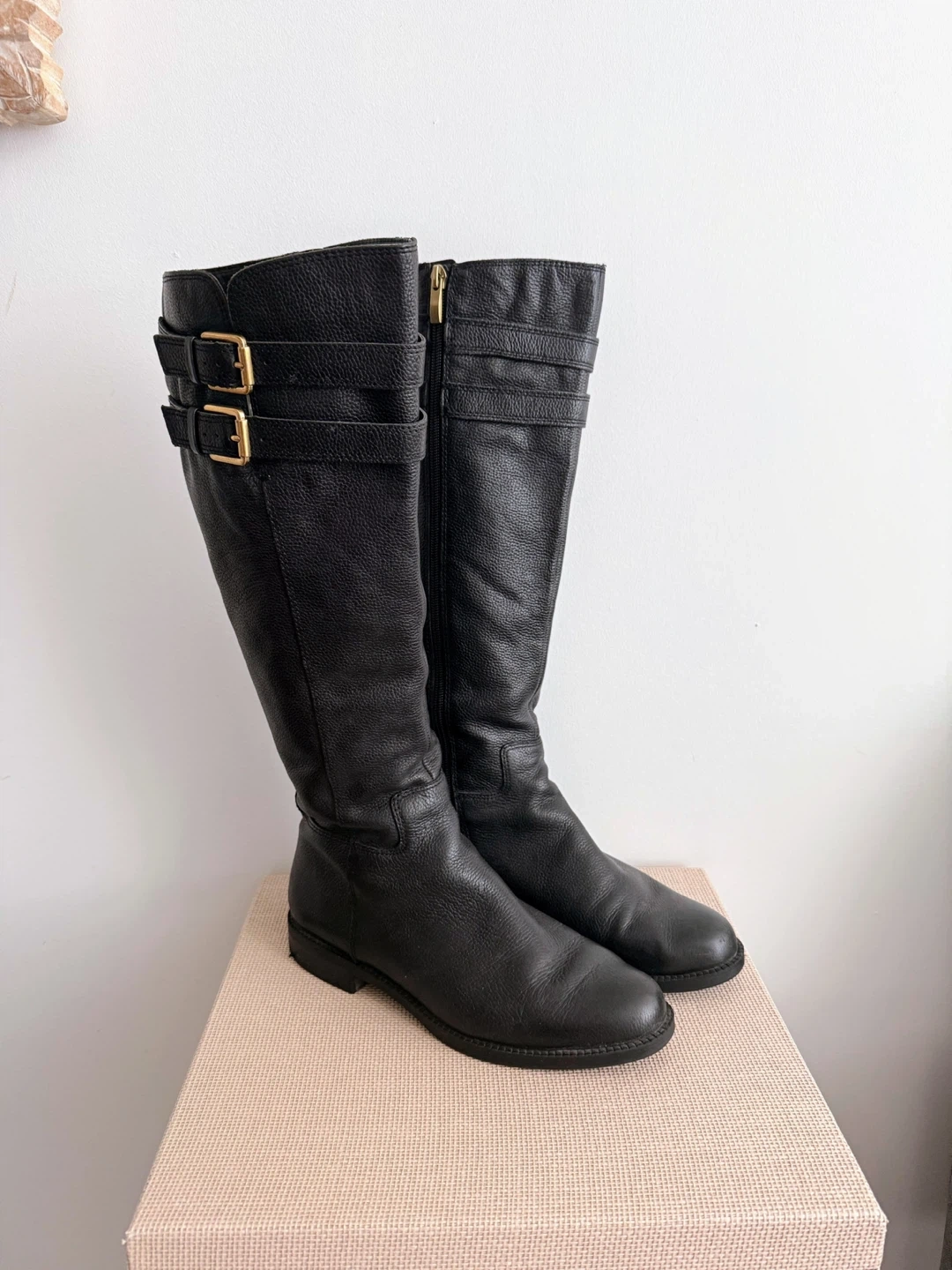 73Franco Sarto Designer Riding Boot Size 7.5 High quality black pebble leather riding boot Inner zipper from bottom to top Decorative belt strap with brushed gold buckle detail
