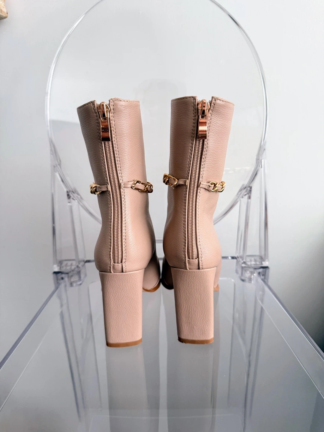 73Bellini designer beige leather high heel boots Lower to mid calf length Gold chain detail Back zipper Wide heel for style and comfort