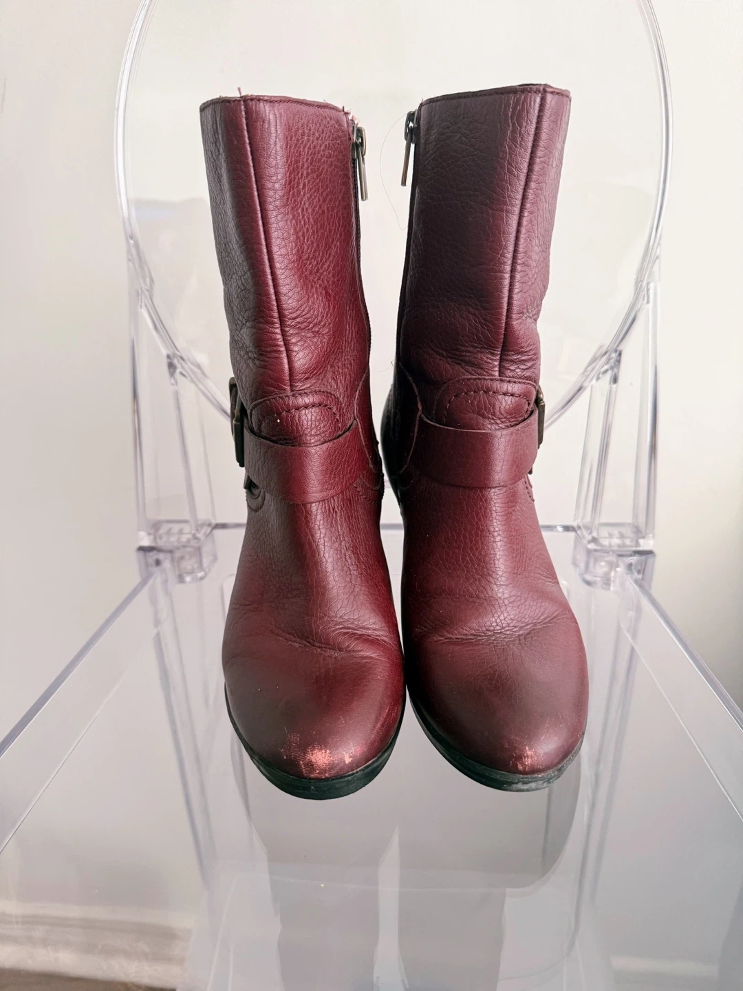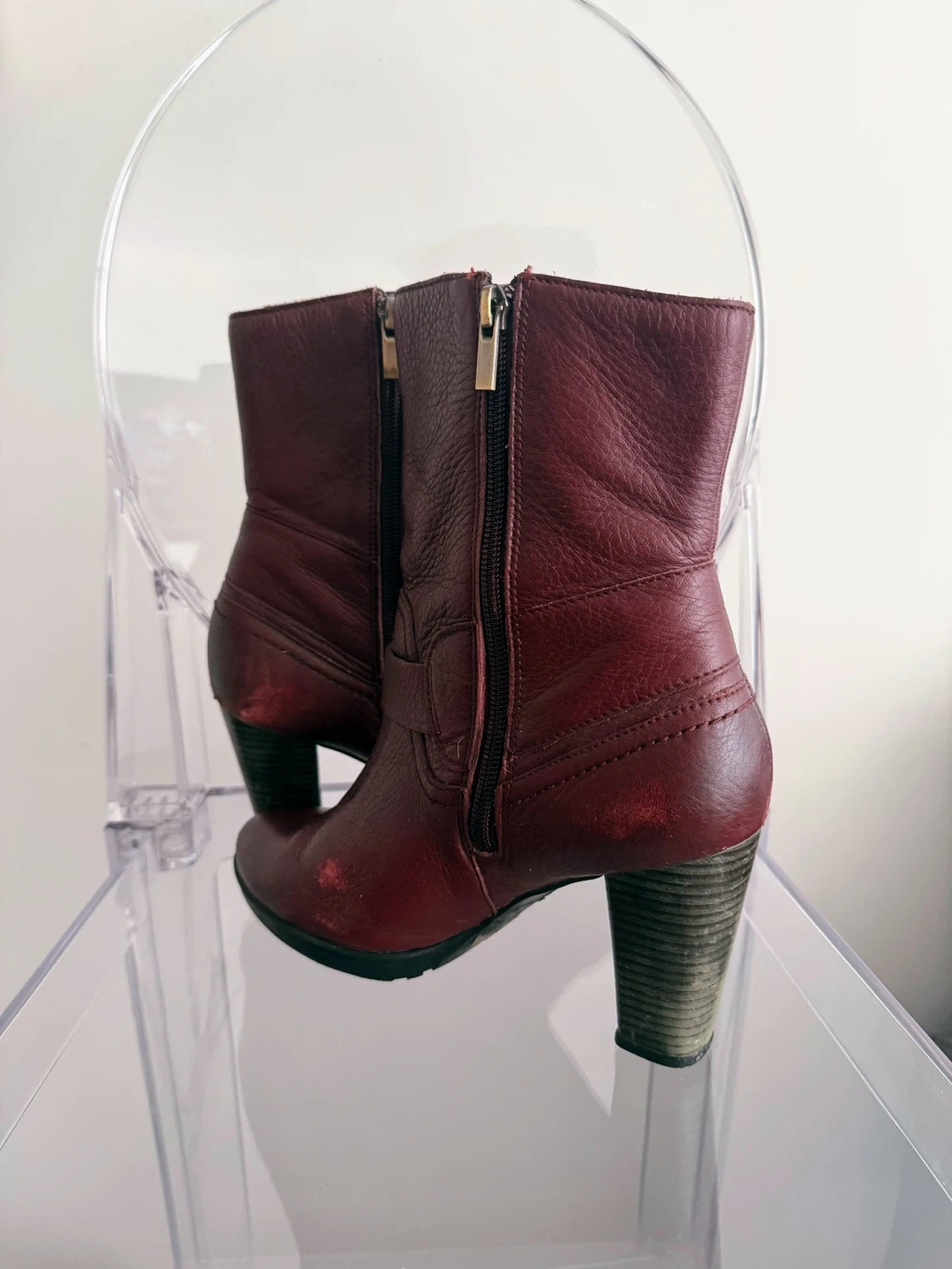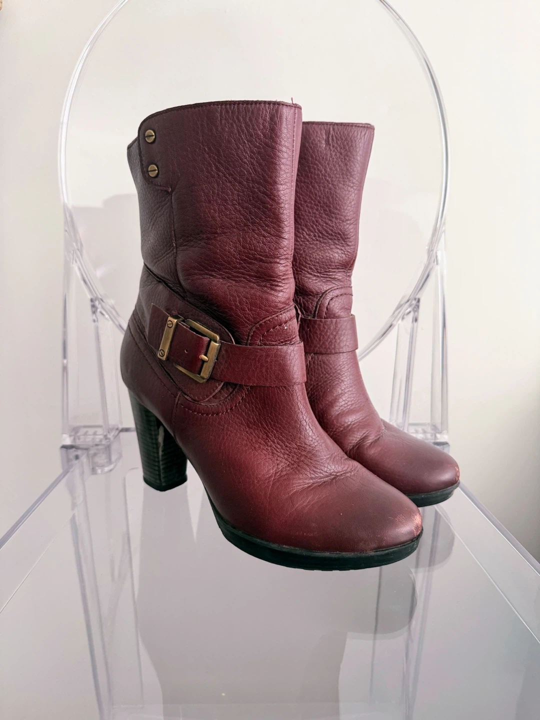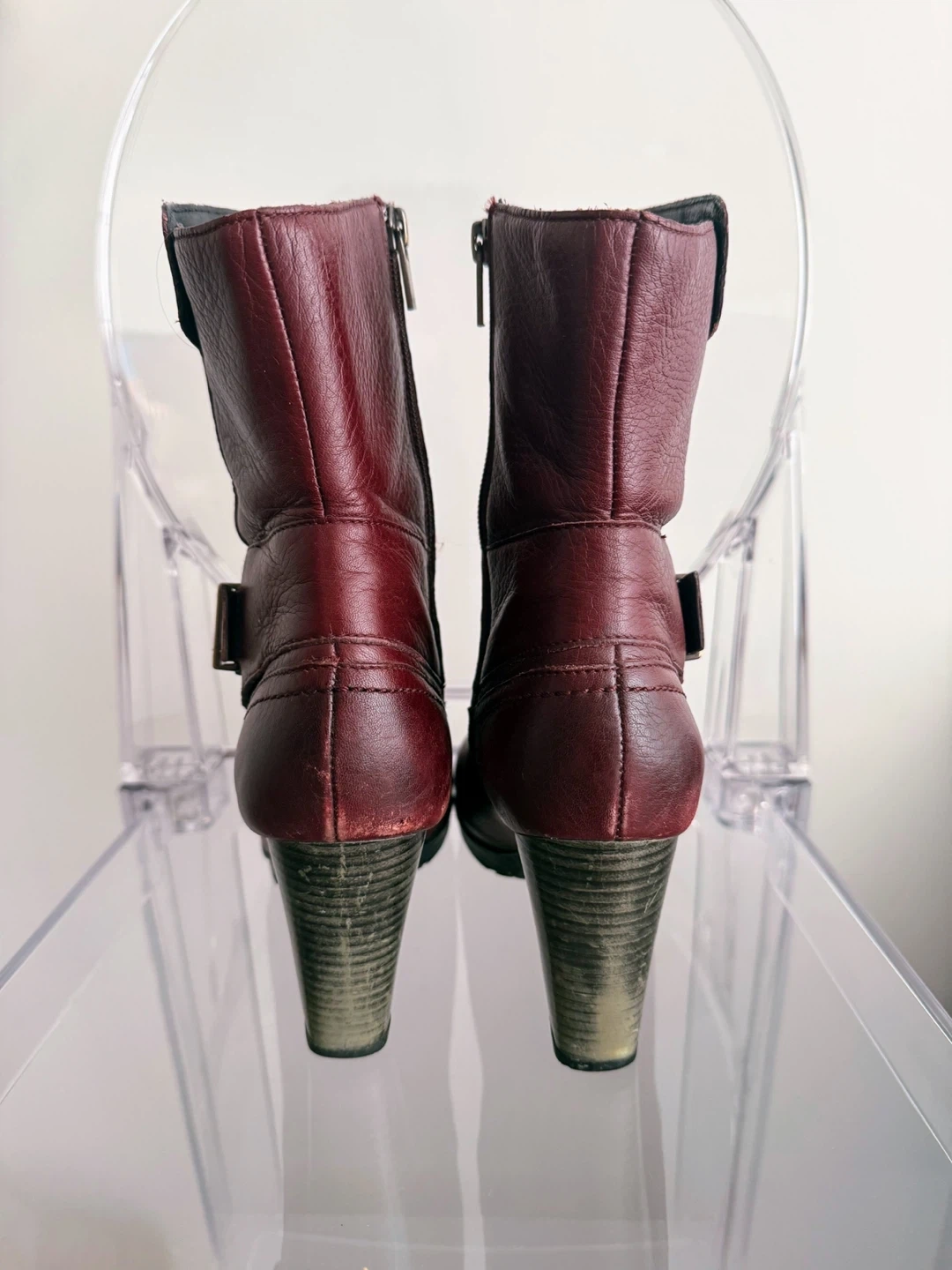 73Clark’s Burgundy high quality leather boots Block heel and modest platform for comfort and style Lower to mid calf length Inner zipper Gold brass buckle detail Worn parts is not damage but part of the look