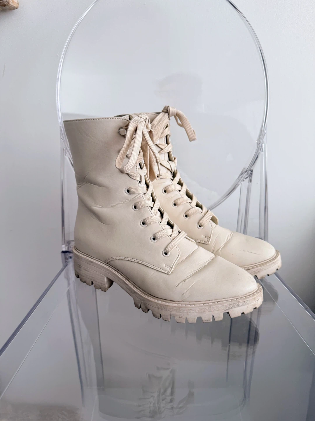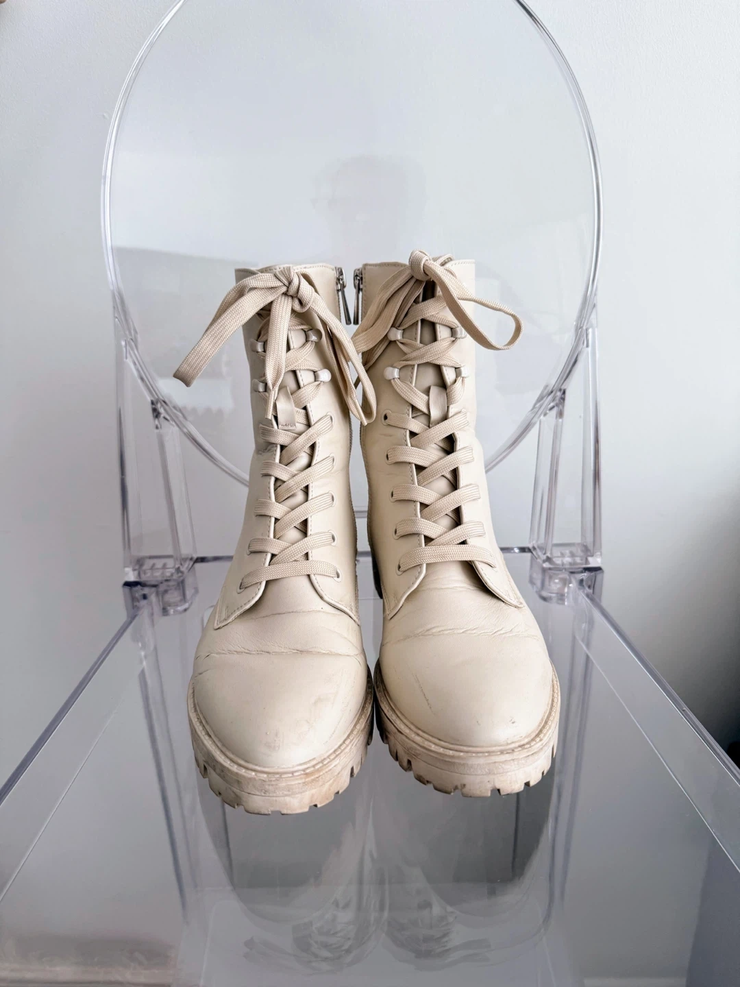 73Design Lab designer light beige combat boots Lower to mid calf length inner zipper Soft point toe