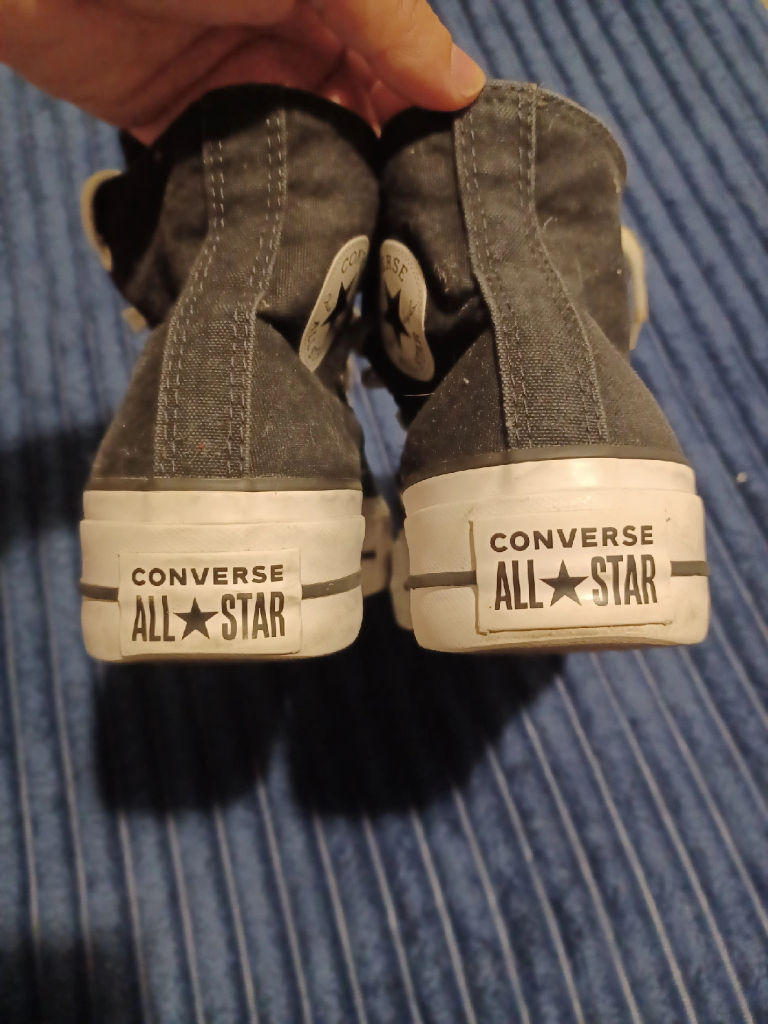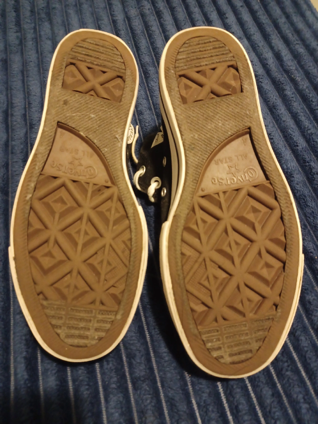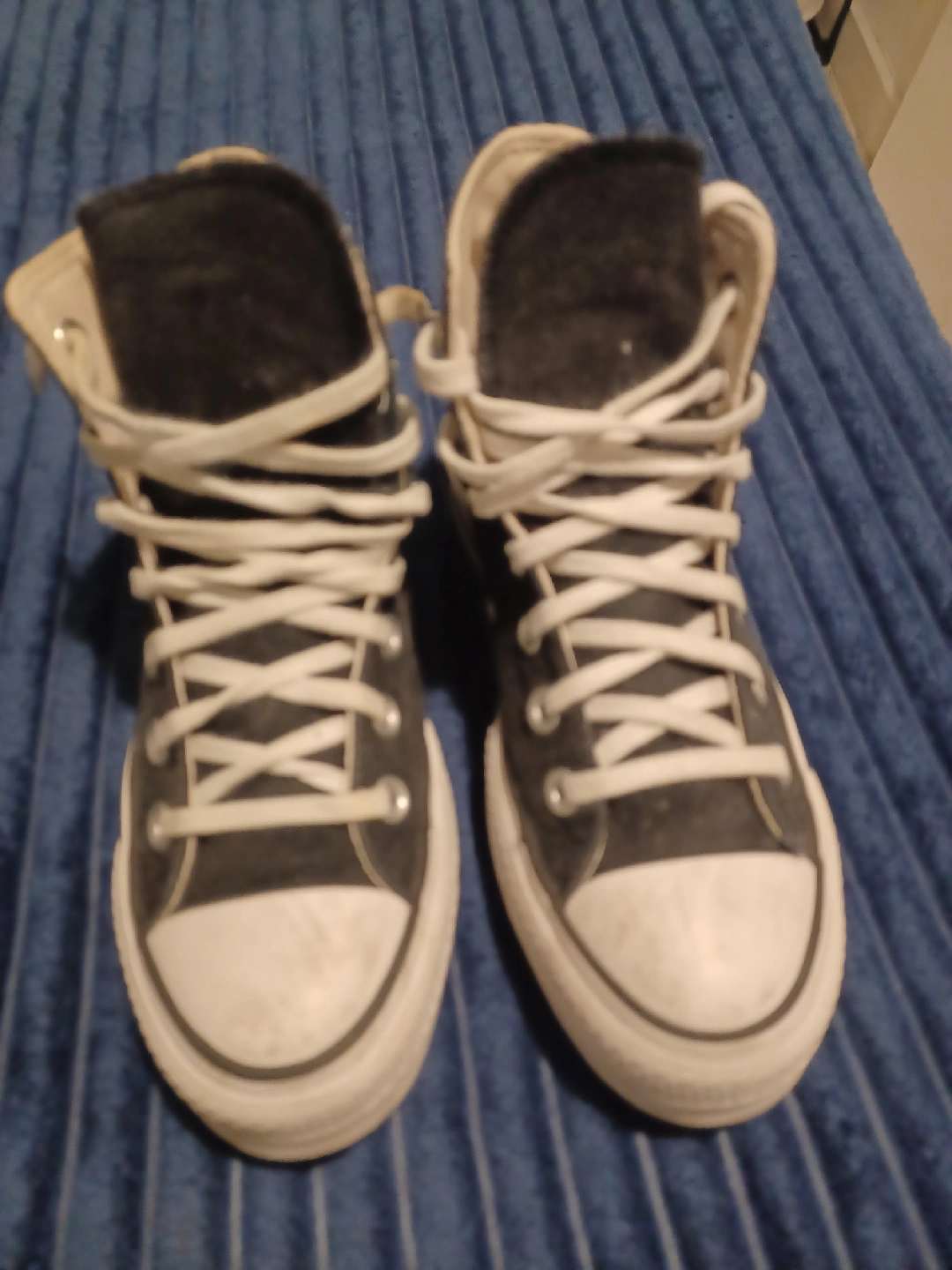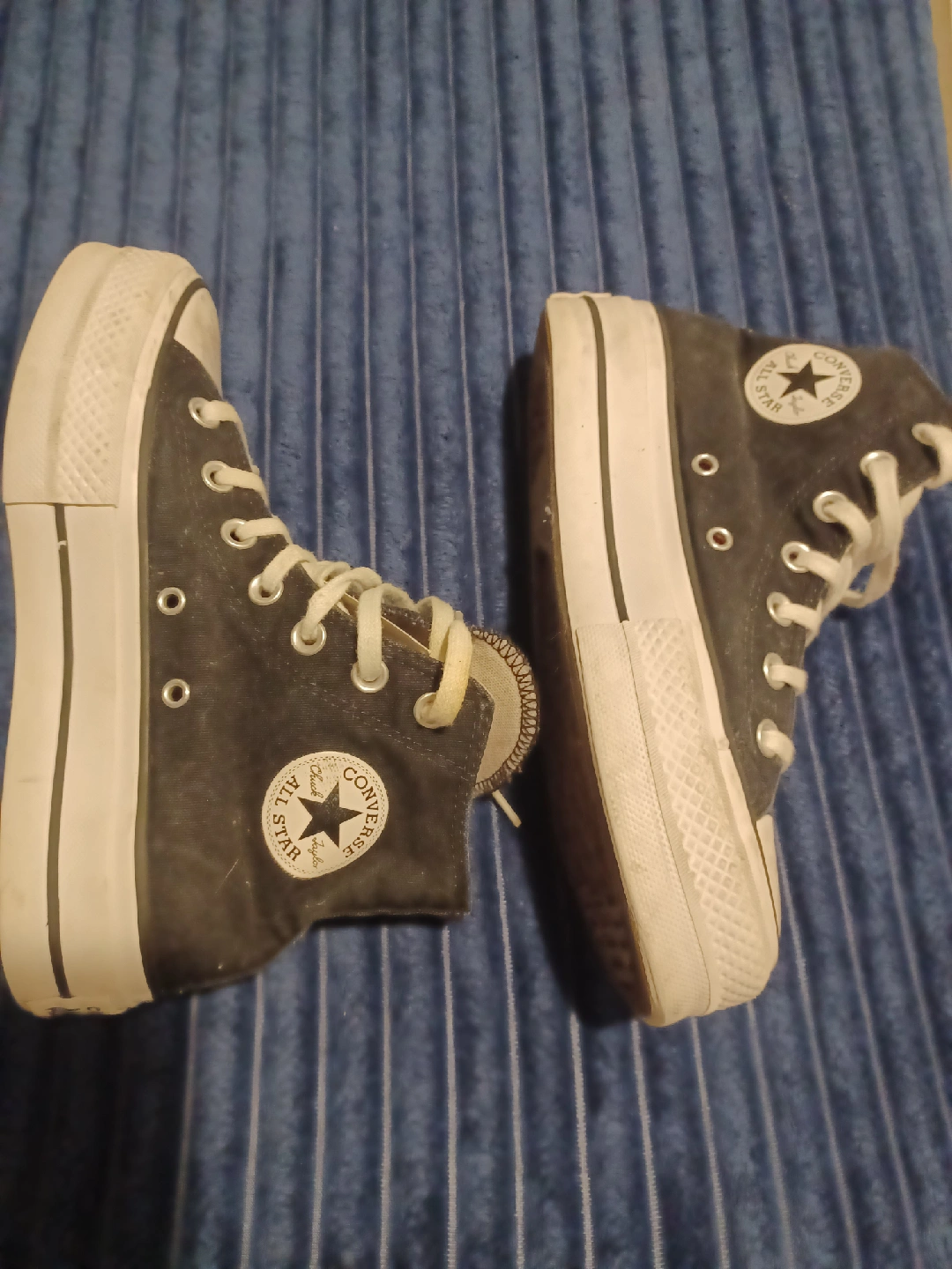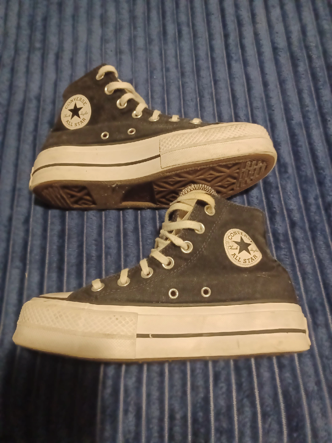 65Selling a pair of Converse All Star high top platform sneakers. They are black and white and have the classic Converse logo on the side. They show some signs of wear. size 36.5