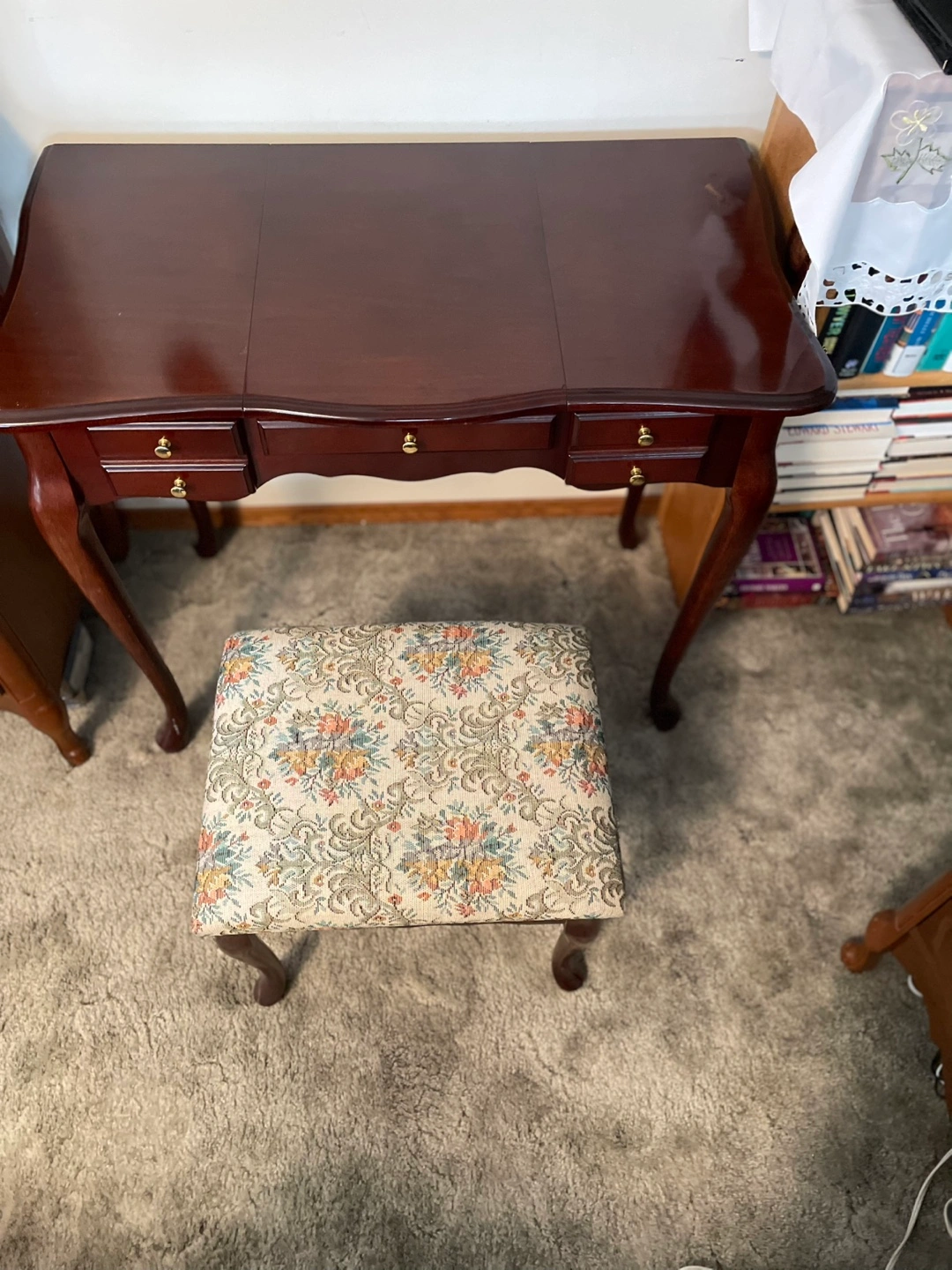 Selling a lovely vanity desk with a matching floral stool! The desk is a rich, dark wood, and it features a lift-up mirror and several small drawers for storage. The stool has a comfortable, cushioned seat with a pretty floral pattern. It's a charming addition to any bedroom or dressing area top right corner has a spot and paint came off 33x 17x29 I only take cash no e-transfers thank you