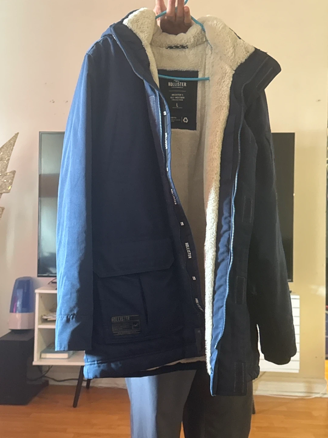 173Selling a Hollister all-weather jacket in navy blue! It's a size large and has a cozy, warm lining. Perfect for the cooler Canadian weather!