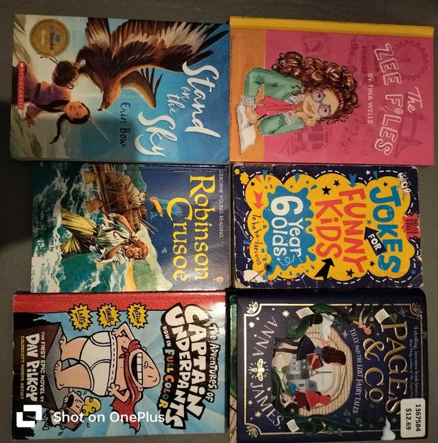 20I'm offering a set of six used children's books, perfect for young readers. Titles include 'Stand on the Sky', 'The Zee Files', 'Robinson Crusoe', 'Funny Jokes for 6 Year Olds', 'Captain Underpants', and 'Tilly and the Lost Fairy Tales'. These books have been enjoyed, so they show some signs of wear, but are still in good readable condition. Reading is an adventure, and these books are ready to take your child on many! If the ad is up, the books are still available!