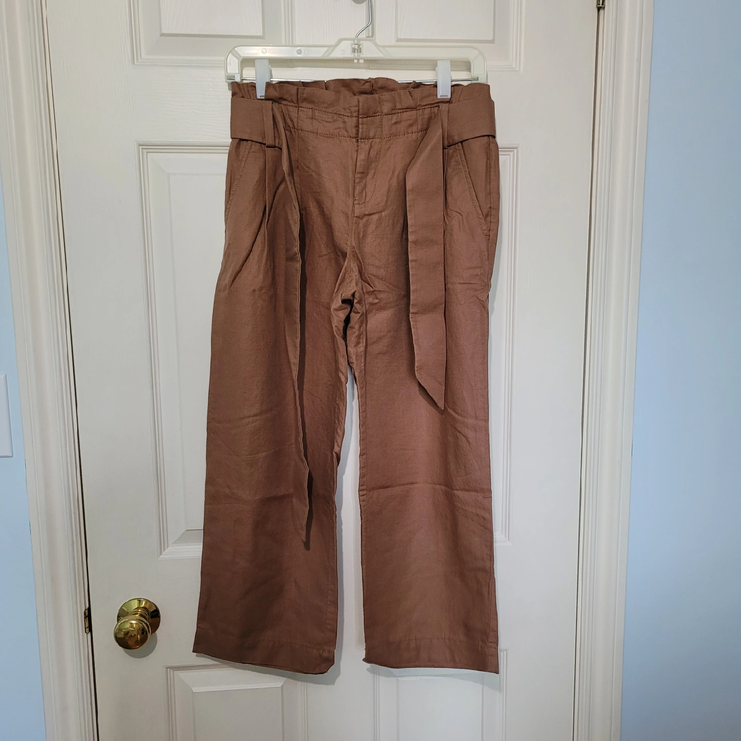 These are a stylish pair of brown wide-leg pants with a paperbag waist detail. They're perfect for a casual yet chic look. Brand new, never worn but tags cut.