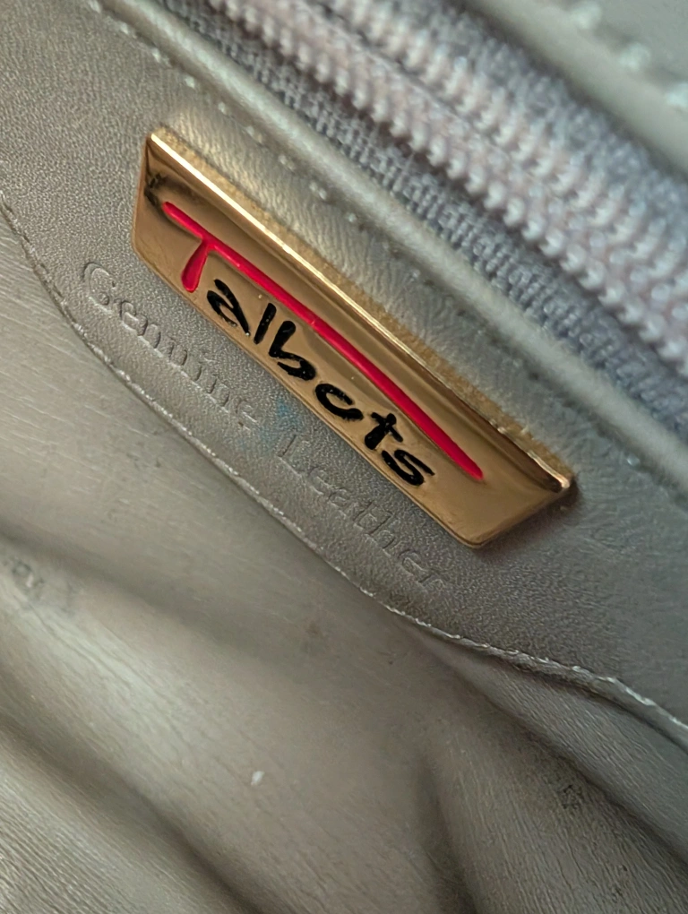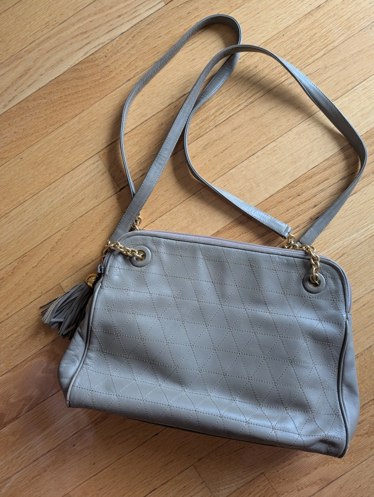 Selling a Talbots leather shoulder bag. It's a light grey colour with gold hardware and a quilted pattern on the front. The inside has some stains and pen marks, as shown in the photos.