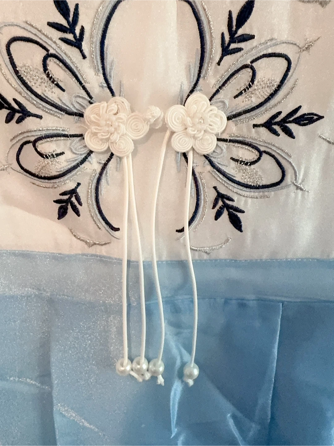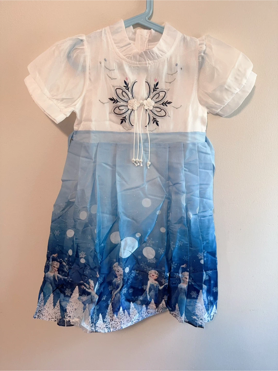 A cute Elsa dress, perfect for your little one! It features a white top with delicate floral embroidery and a flowing blue skirt with images of Elsa and snowflakes.