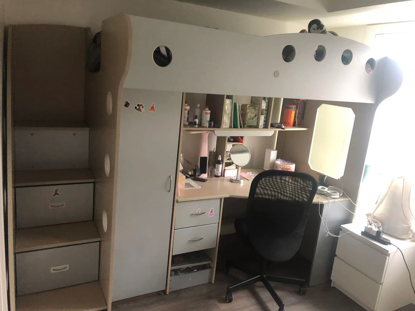 93Selling a loft bed that includes a built-in desk and plenty of storage! It's a great space-saving solution for a kid's or teen's room. The bed is elevated, creating a cozy study or play area underneath. Perfect for smaller spaces! I think you better need a moving team to move it.