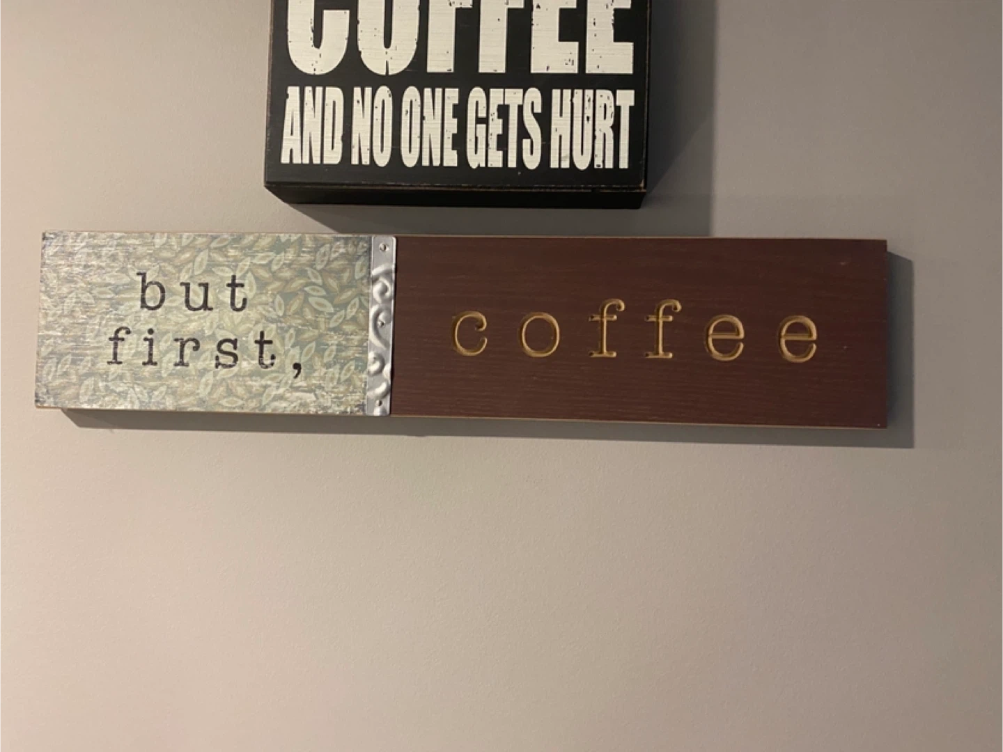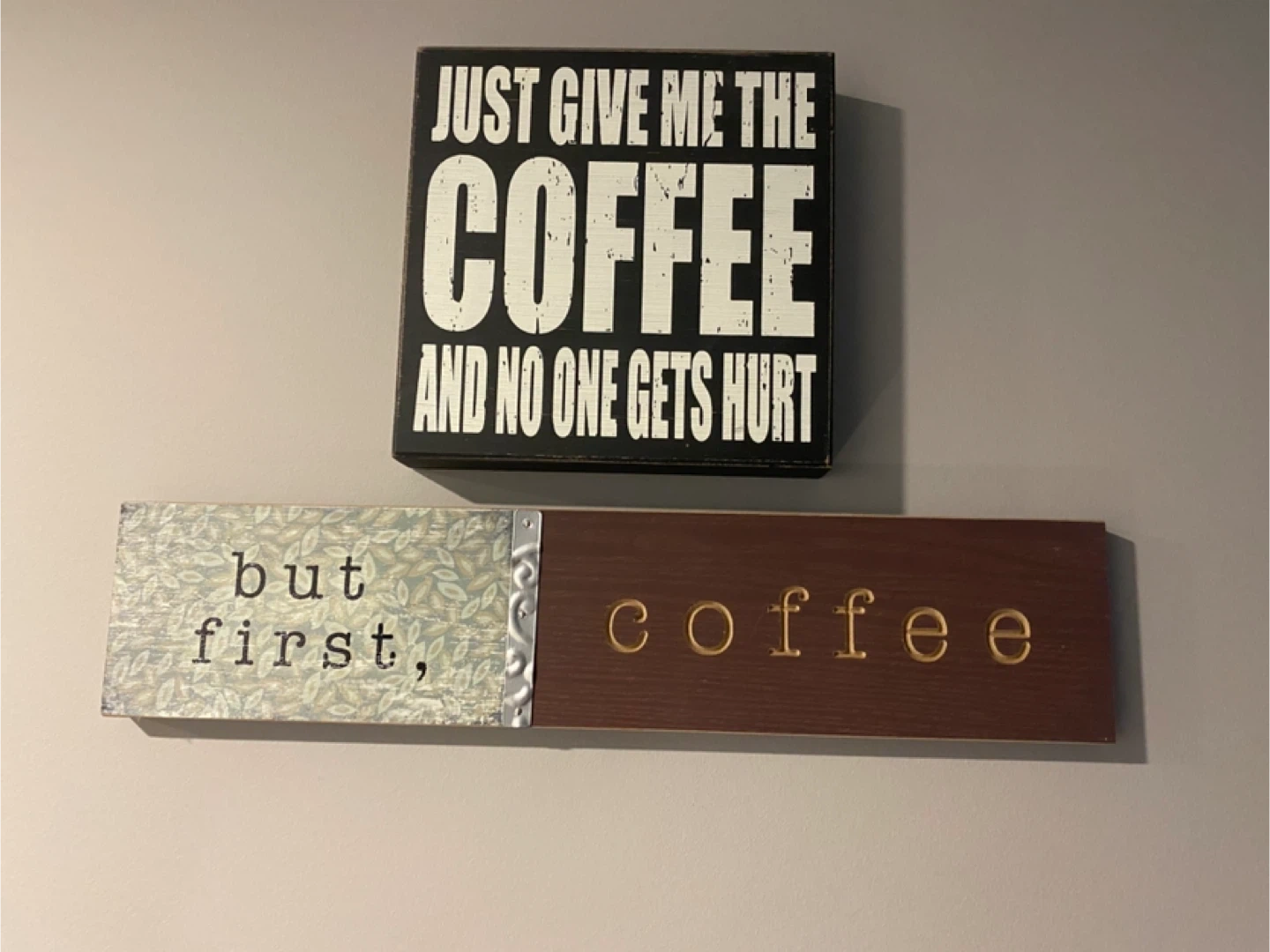 Two cute coffee-themed wall art signs to brighten up your kitchen or coffee nook! The top sign says, "Just give me the coffee and no one gets hurt," and the bottom one says, "But first, coffee"