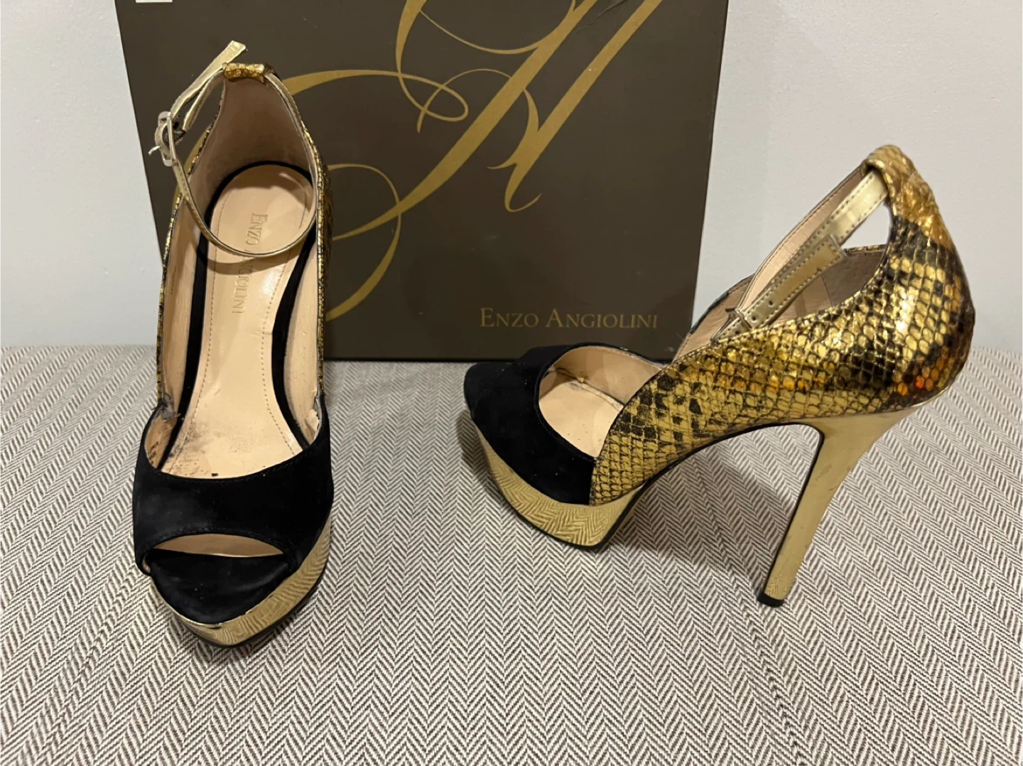 Selling a pair of Enzo Angiolini heels in black and gold. They feature a peep toe and an ankle strap. Comes with the original box!