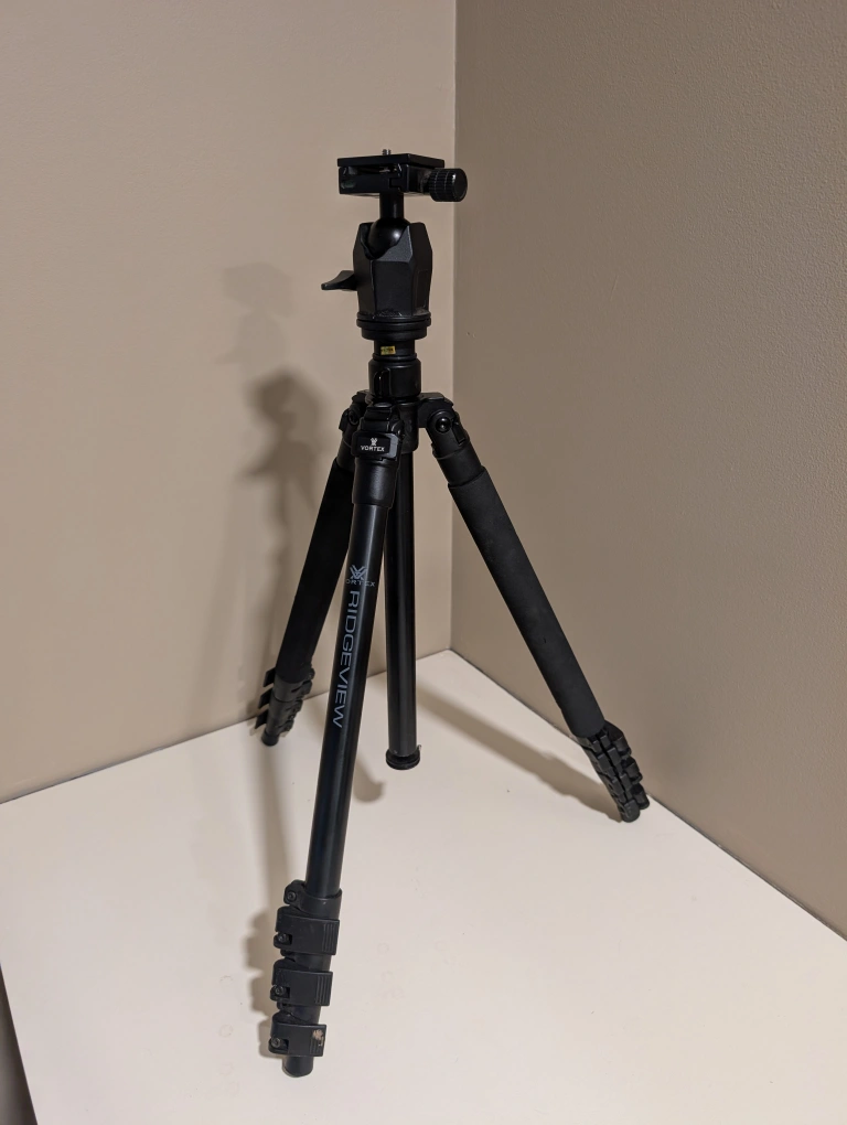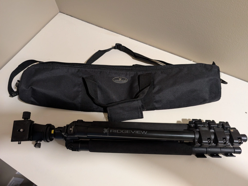 Selling a Vortex Ridgeview tripod in great shape! It's black and comes with its carrying bag. This tripod is sturdy and reliable, perfect for photography, videography, and spotting scopes for hunting.