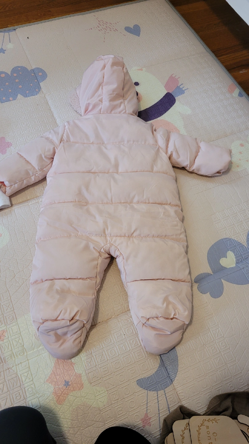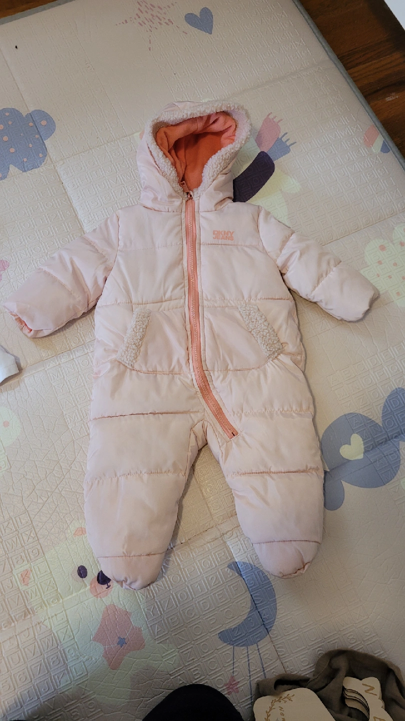 Keep your little one warm with this adorable DKNY baby snowsuit! It's in great condition and perfect for those chilly Canadian days. my baby wote it once only. The snowsuit is a lovely shade of pink and features a cozy hood to protect your baby from the elements. Perfect for winter!