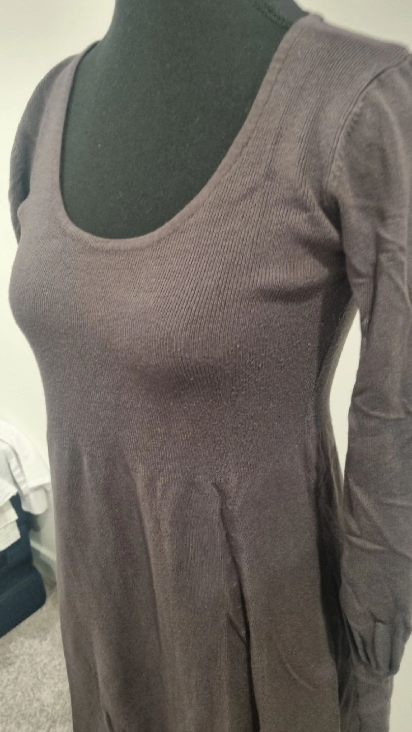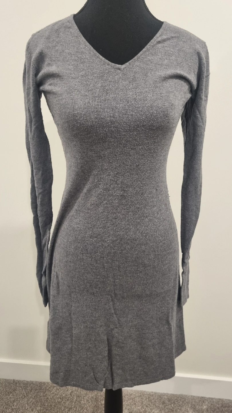 109Selling a comfy grey knit sweater dress! It's in great condition and perfect for layering during the cooler months. The dress has a flattering V-neck and long sleeves, making it a versatile addition to your wardrobe