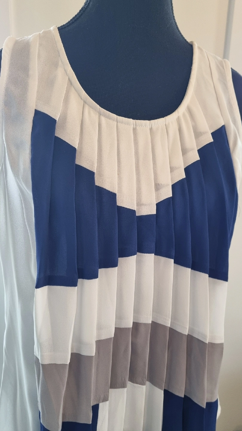 Here's a stylish sleeveless blouse in a unique colour block design, featuring blue, white, and grey. It's in great condition and ready for a new home! Perfect for summer or layering