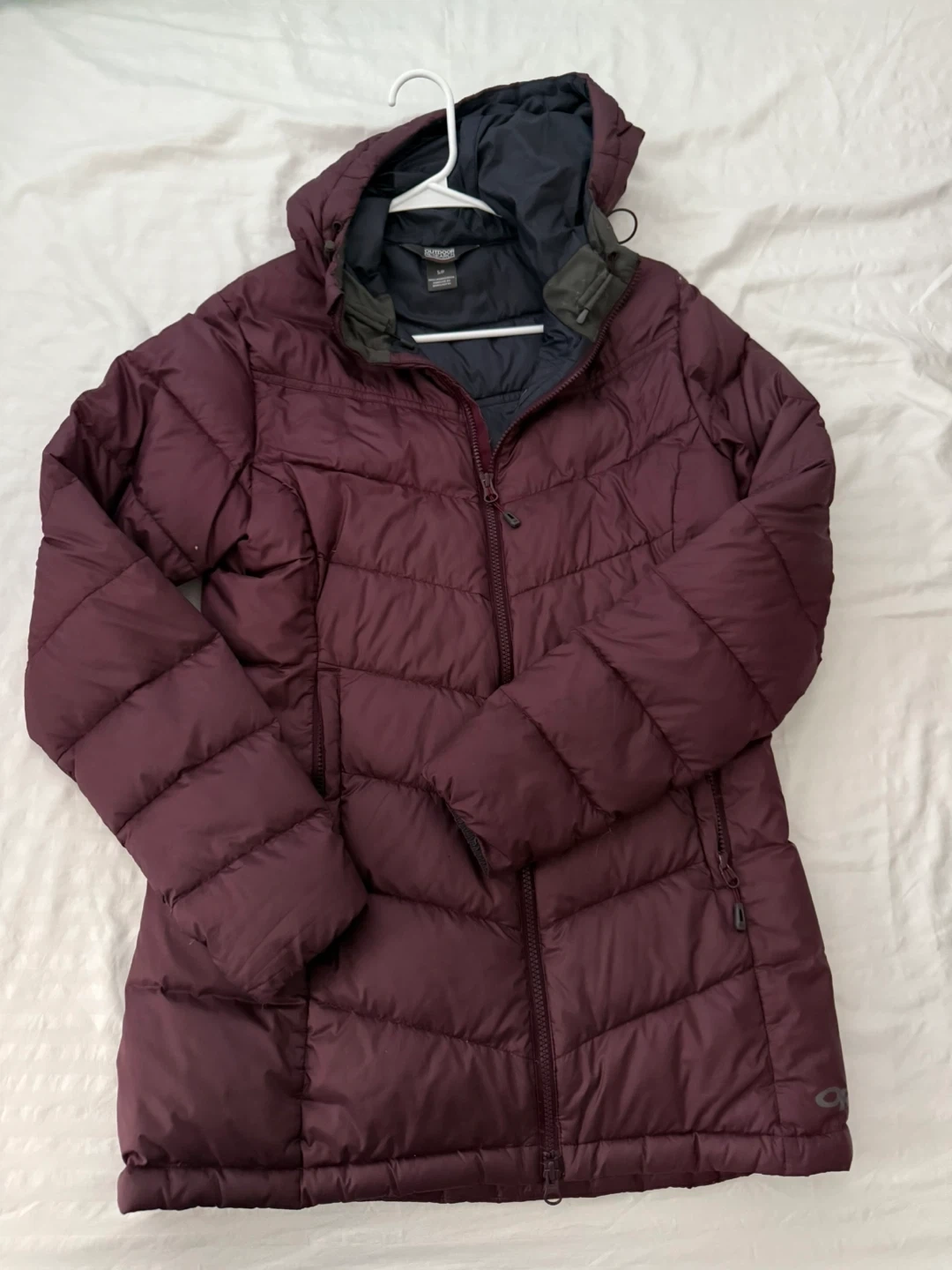 Selling a women's puffer jacket from Outdoor Research. It's a size small and in great condition. The colour is a lovely burgundy. Perfect for staying warm this winter!