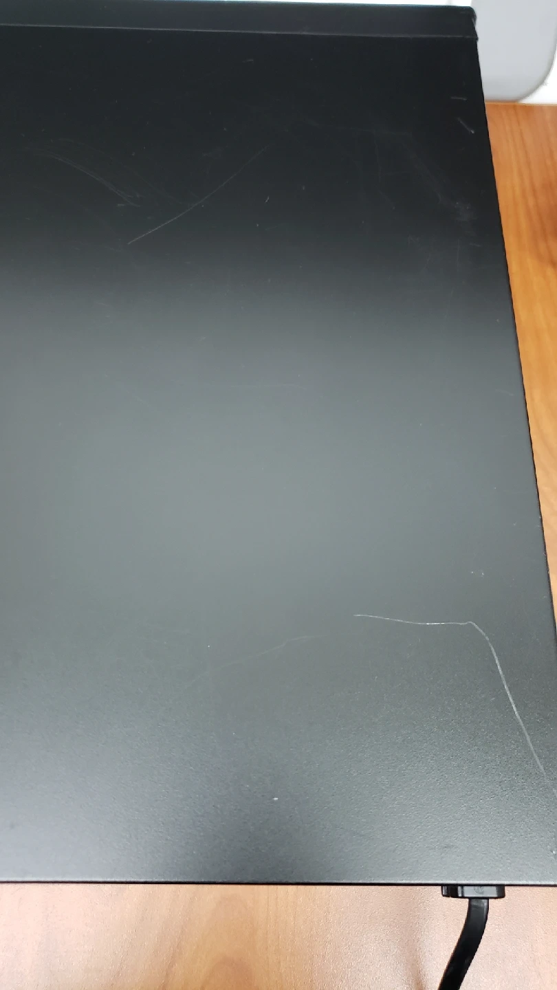 Some light marks on the top, 2 small marks on the display panel and 1 just below on the face of the CD tray. The CD player works as designed. No remote.