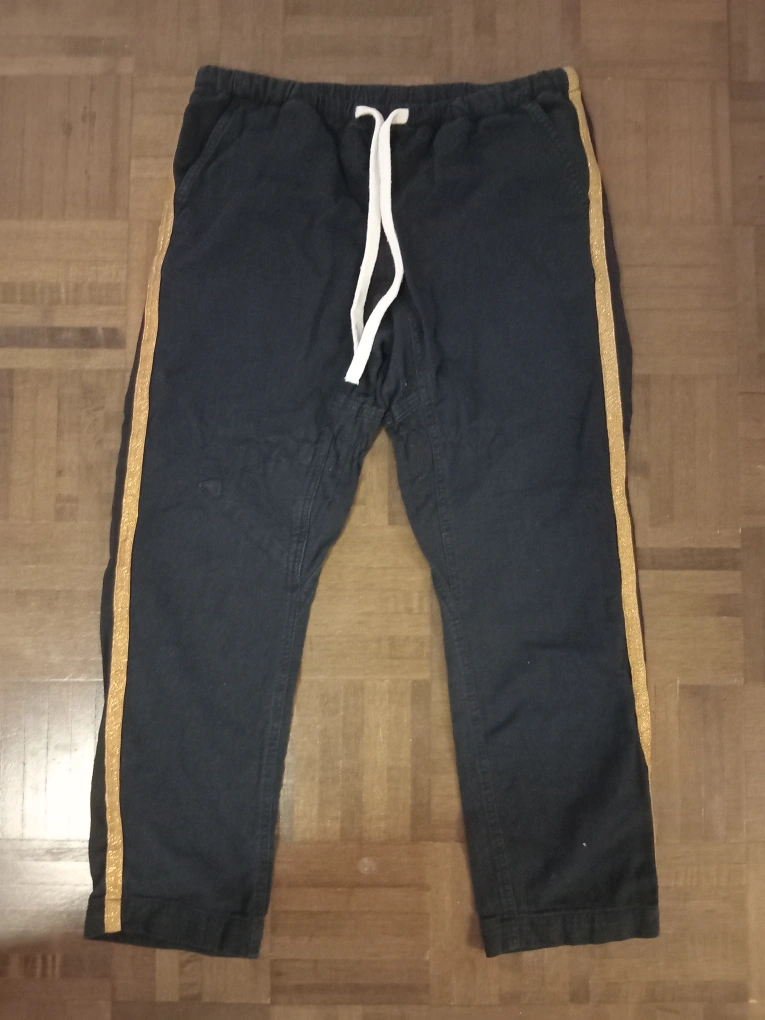 277Selling a pair of Freecity black pants in size small. They feature a comfortable fit and a stylish design with gold stripes. Great for casual wear!