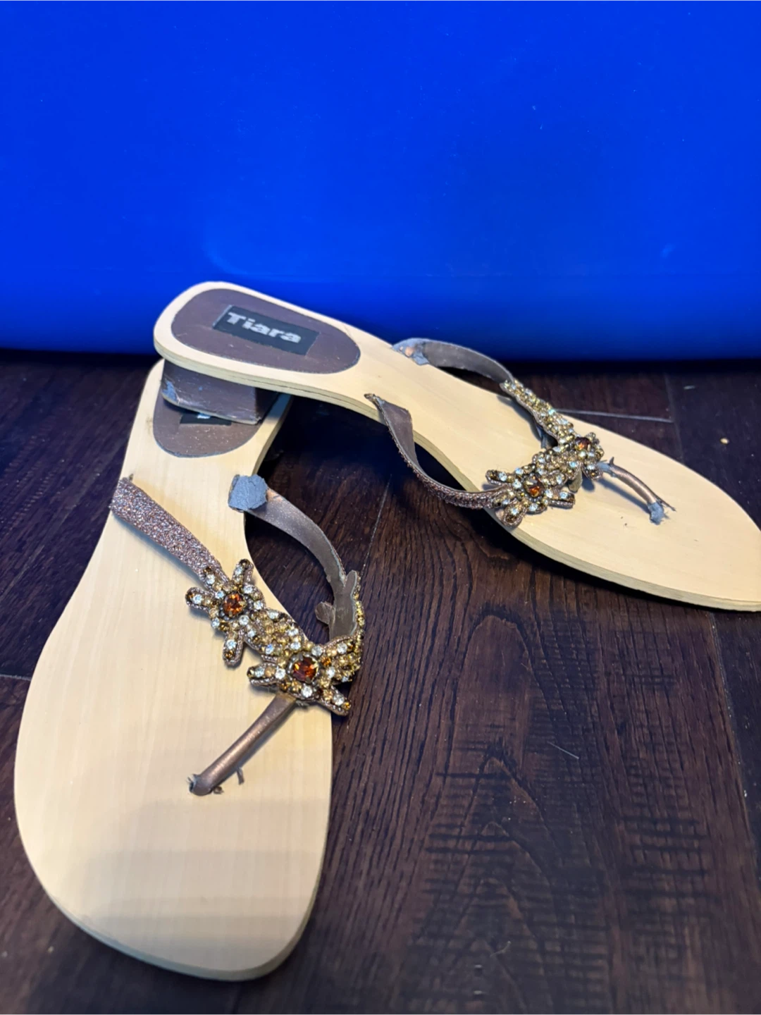 Cute Tiara flip flops with sparkly embellishments! These are perfect for adding a touch of glam to your summer outfits. They're in great condition and ready for a new home