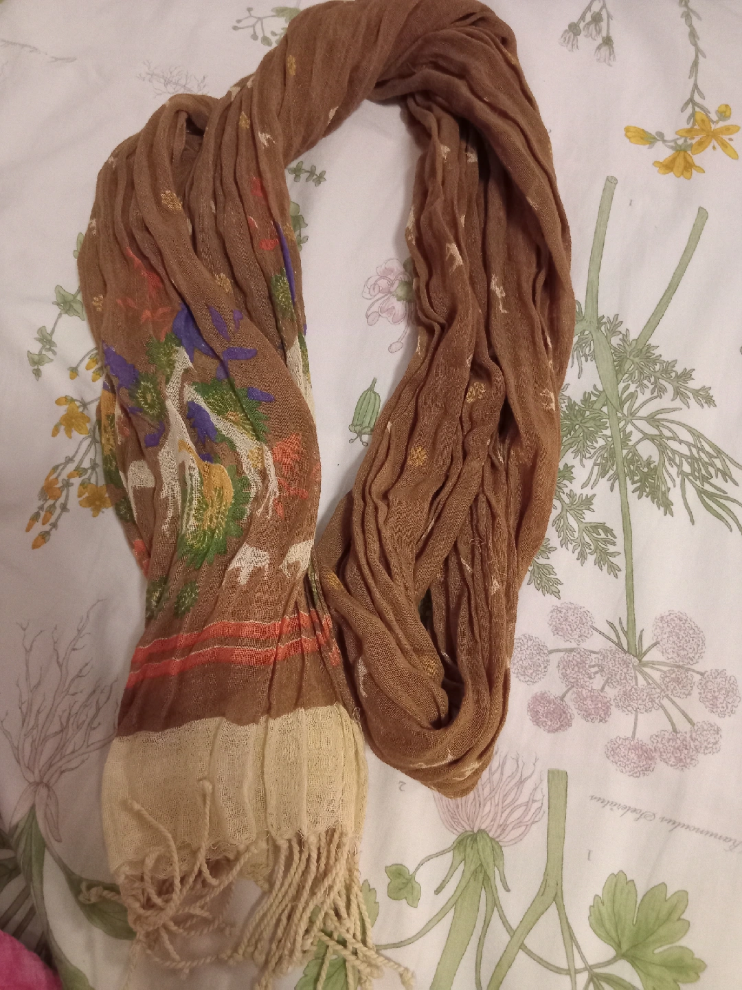 277A lovely brown scarf made of 100% cotton! It has a beautiful pattern and fringed edges