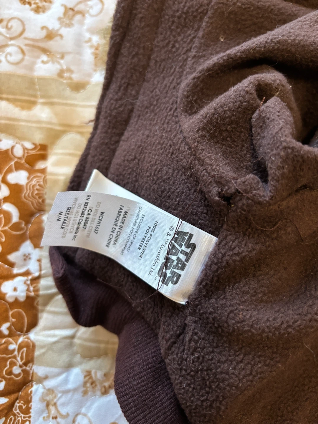 - Brown and features a faux fur hood and Chewbacca's signature bandolier.