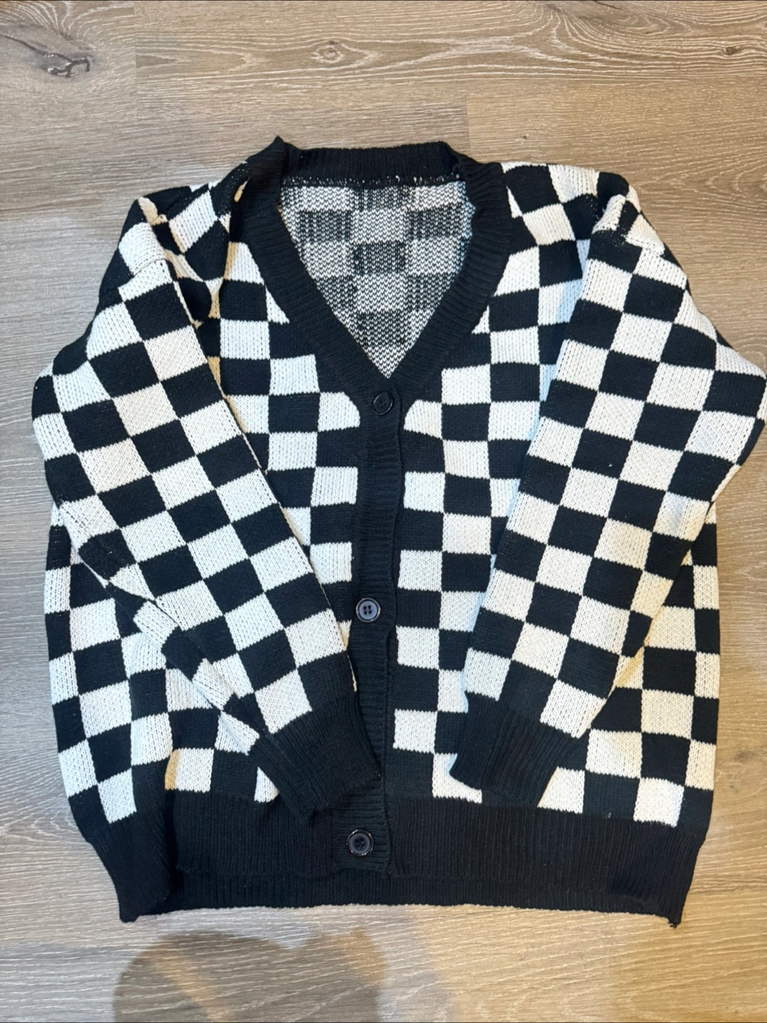 Selling a cute checkered cardigan in black and white! It's in great condition and perfect for layering or wearing on its own. The pattern is super trendy, and it's a comfy, stylish piece to add to your wardrobe