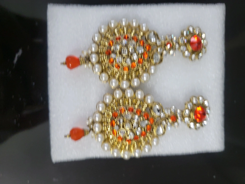 Beautiful pair of earrings featuring pearls and orange gemstones. These earrings would be perfect for a special occasion or to add a touch of elegance to any outfit.